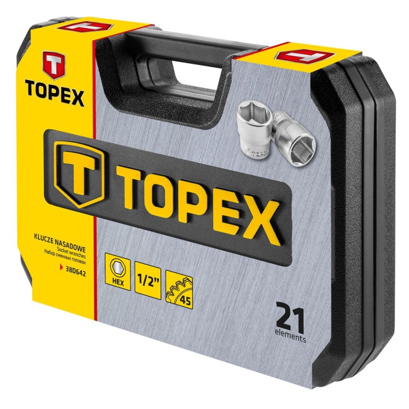 - Der 1/2"-Steckschlüsselsatz von TOPEX besteht aus 21 Teilen, die in einem praktischen Kunststoffkoffer sortiert sind