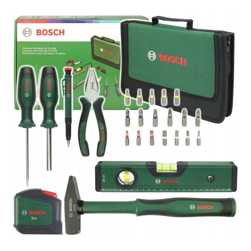 Das 25-teilige Bosch Universal-Handwerkzeugset ist gut ausgestattet und ermöglicht die Durchführung zahlreicher Reparaturen, Heimwerkerarbeiten, Wartungs- und Dekorationsarbeiten zu Hause oder unterwegs. Das Werkzeugset enthält eine Zange, einen Universalschraubendreher, einen 300-g-Ingenieurhammer mit Glasfaserkern, einen Stechdorn, ein 3 m langes Maßband, eine 25 cm lange Wasserwaage, einen Tieflochmarkierer sowie 18 Schraubendreherbits in verschiedenen Größen. Die Werkzeuge wurden aus hochwertigen Materialien gefertigt und gewährleisten Robustheit sowie eine lange Lebensdauer. Ergonomische Eigenschaften, wie z. B. Softgrip-Griffschalen und abgerundete Formen, garantieren optimalen Bedienkomfort und sind in einer praktischen, mit Reißverschluss verschließbaren Tasche untergebracht.