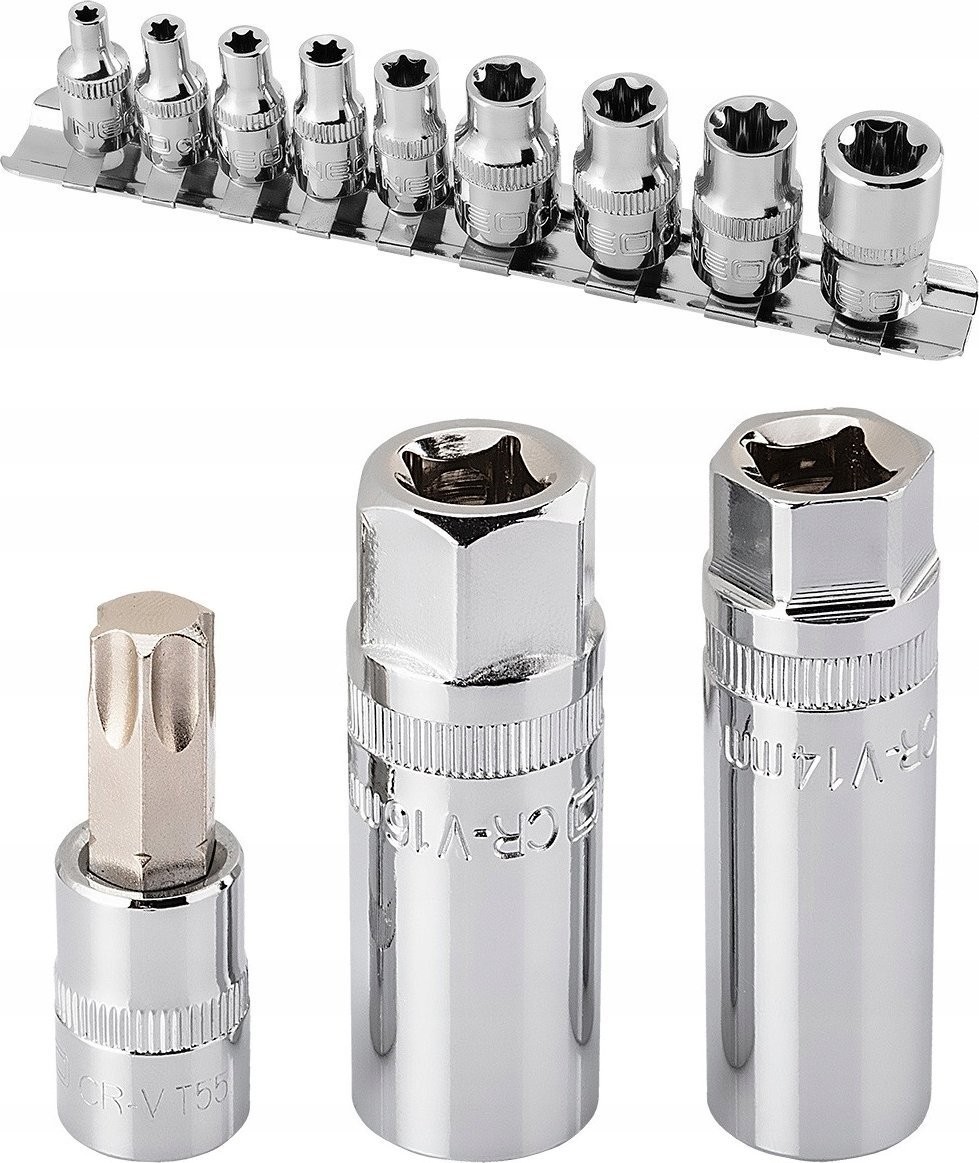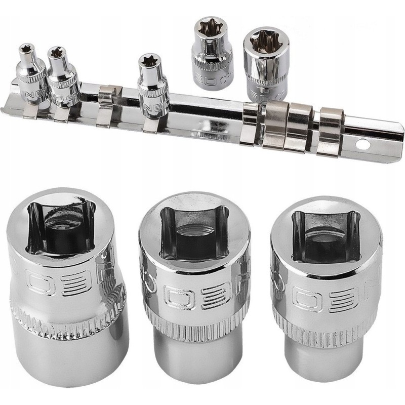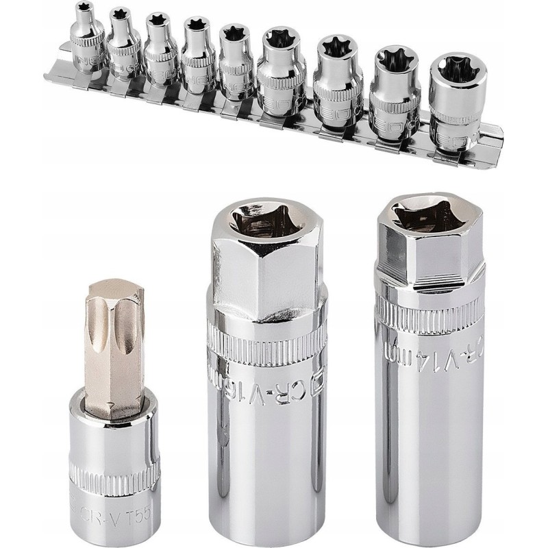 - 5x Torx-Steckschlüsseleinsätze ¼” (Größen: E4, E5, E6, E7, E8)