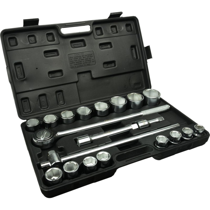 Satz von Steckschlüsseln der Marke GEKO, bestehend aus 21 Teilen. Der Satz enthält einen Satz Sechskant-Steckschlüsseleinsätze mit 3/4"-Aufnahme, einen T-Griff (3/4"), eine Ratsche (3/4") sowie einen Satz Verlängerungen (3/4"). Alle Teile des Sets sind aus hochwertigem CrV-Chrom-Vanadium-Stahl gefertigt. Das Ganze befindet sich in einem praktischen Koffer aus strapazierfähigem Kunststoff.