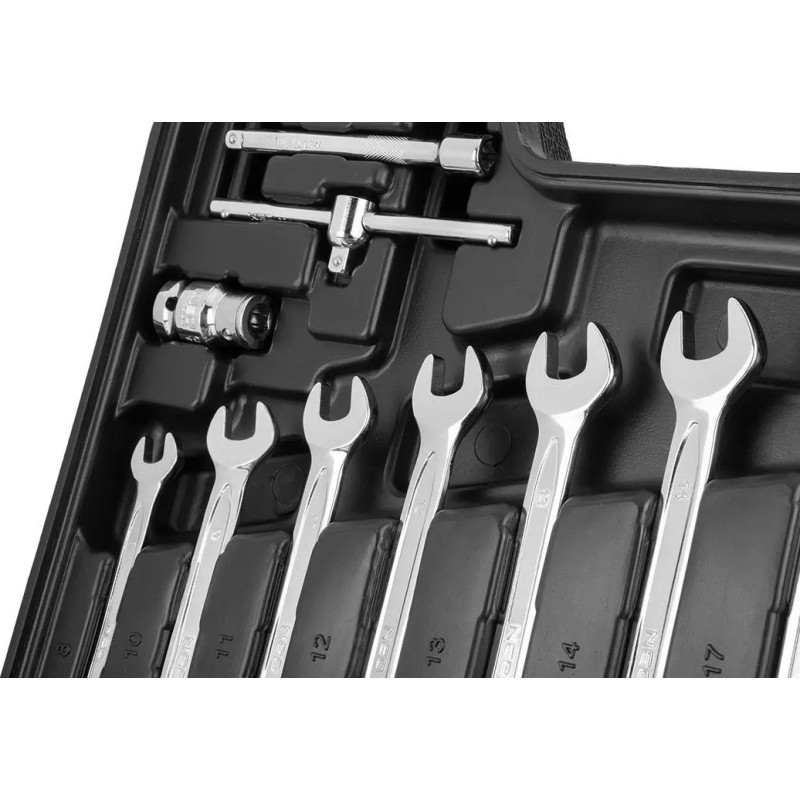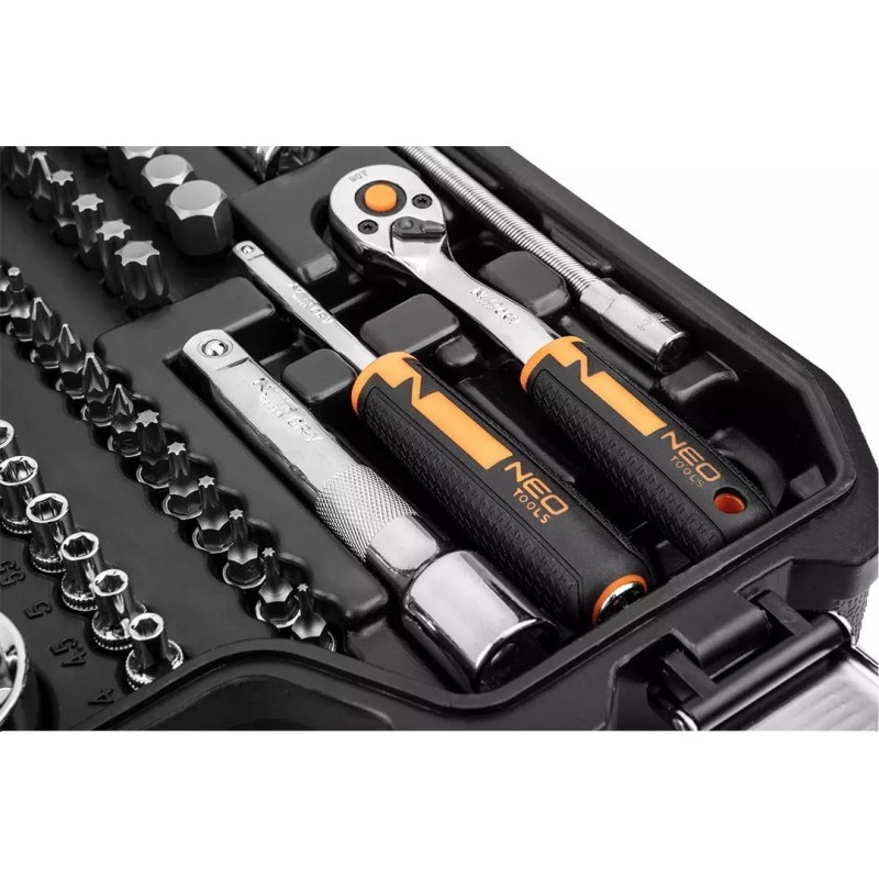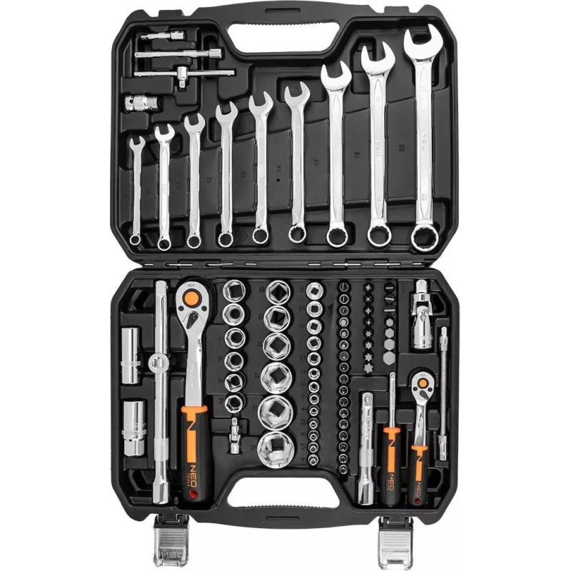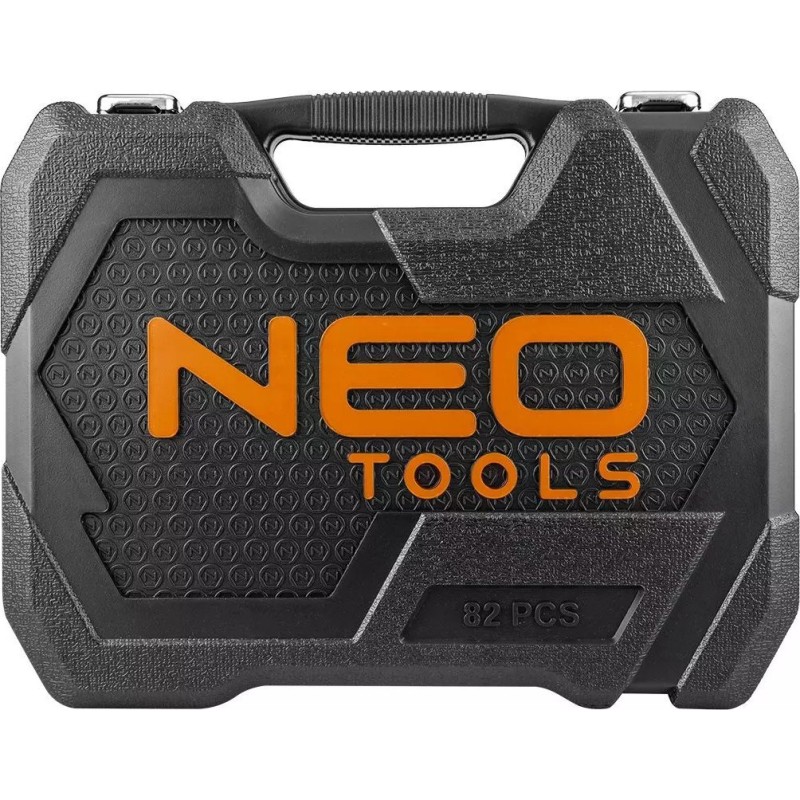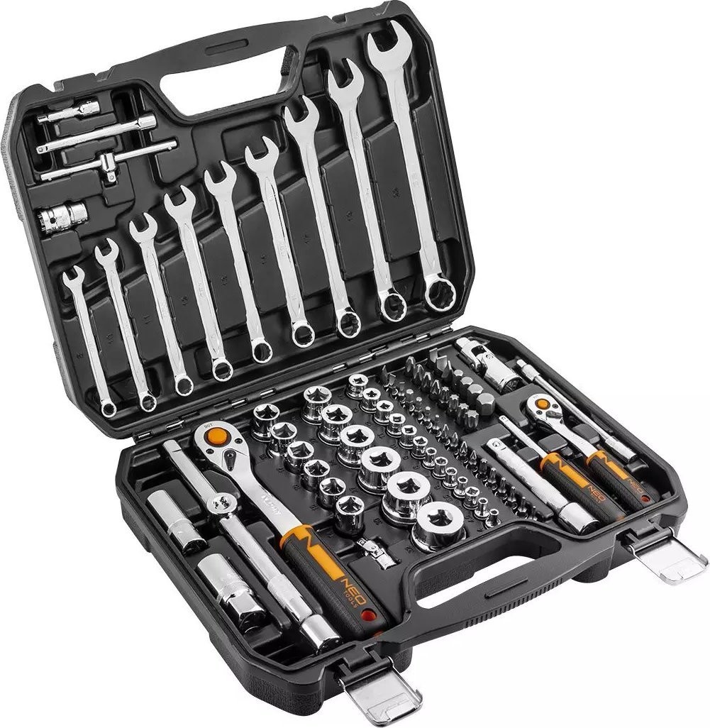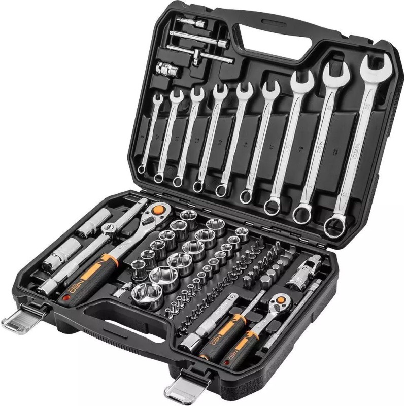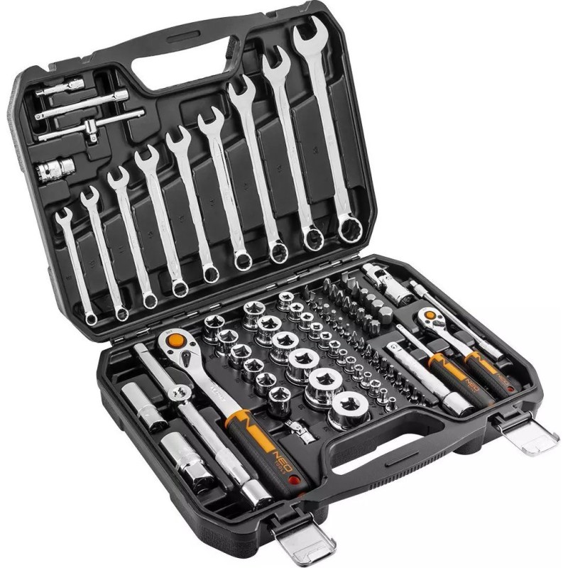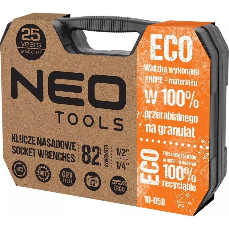 Hochwertiges, vielseitiges ½"- und ¼"-ECO-Steckschlüsselset mit 82 Werkzeugen und Zubehör der Marke NEO. Die Produkte werden in einem praktischen Kunststoffkoffer mit Metallverschlüssen und einem handlichen Griff angeboten. Zudem ist das Innere der Verpackung mit einer speziellen Einlage ausgekleidet, die für Ordnung sorgt und den Inhalt vor Beschädigungen schützt.
