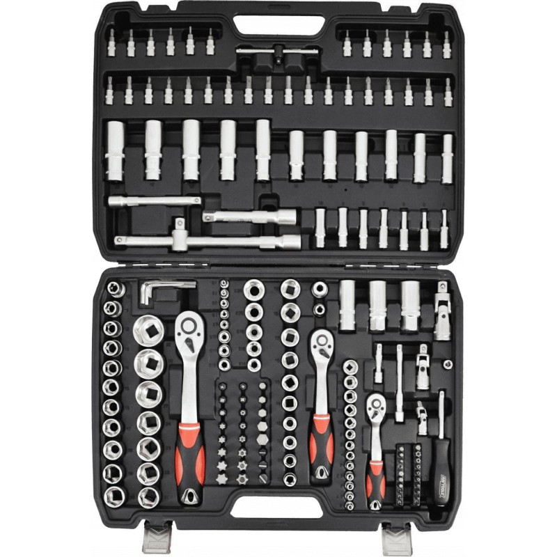Professioneller Ratschenschlüsselsatz mit 1/2", 3/8" und 1/4" Antrieb. Der doppelseitige Ratschenschlüssel eignet sich ideal zum Anziehen und Lösen von Schrauben an schwer zugänglichen Stellen. Der Schnellspannknopf ermöglicht einen schnellen Wechsel von Steckschlüsseleinsätzen und Bits. Der Ratschenmechanismus ist mit 72 Zähnen ausgestattet – mit einem Rastabstand von 5 Grad. Der Hebel an der Rückseite des Kopfes ermöglicht einen schnellen und reibungslosen Richtungswechsel. Der weiche, gummierte Griff sorgt für einen bequemen Halt. Alle Aufsätze sind zur leichteren Identifizierung mit einer Größenangabe versehen. Dank der übersichtlichen Anordnung aller Teile im Werkzeugkoffer ist dieses Set leicht zu transportieren.