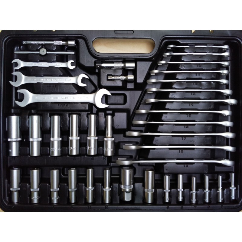 Alle Teile des Sets sind aus einer speziellen Werkzeugstahllegierung (Chrom-Vanadium, Cr-V) gefertigt, die sich durch erhöhte Korrosions- und Rostbeständigkeit auszeichnet. Der Legierungszusatz „Chrom“ verbessert die Härtbarkeit des Stahls erheblich. Der Legierungszusatz „Vanadium“ erhöht die Duktilität des Stahls bei der Wärmebehandlung, was sich positiv auf die Beständigkeit gegen hohe Temperaturen und die Verformungsfestigkeit auswirkt.