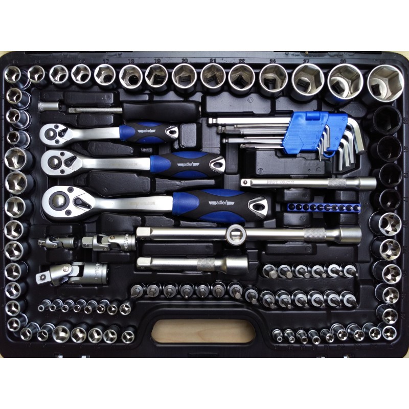 Wir präsentieren Ihnen einen neu in unser Sortiment aufgenommenen, hochwertigen Ratschenschlüsselsatz mit einem Komplettset an Steckschlüsseleinsätzen, Bits und weiteren Werkzeugen.