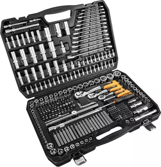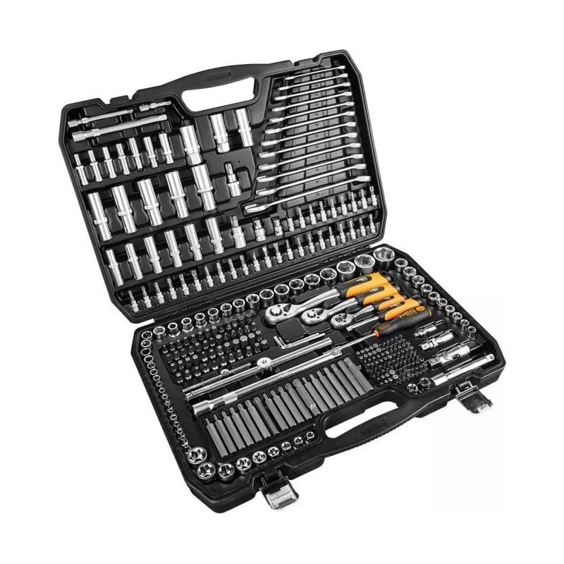 Umfassendes Set mit Schraubenschlüsseln und Zubehör der Marke NEO, bestehend aus 300 Teilen mit den Befestigungsdurchmessern ½”, 3/8” und 1/4”. Ein Werkzeugangebot mit 25 Jahren Garantie für die anspruchsvollsten Anwender, das die höchste Qualität der angebotenen Produkte bestätigt. Enthält die unverzichtbare Ausrüstung für jeden Heimwerker, u. a. Ring-Maulschlüssel, Sechskantschlüssel, Steckschlüsseleinsätze, Ratschen, Drehknöpfe, Verlängerungen, Halterungen und vieles mehr.
