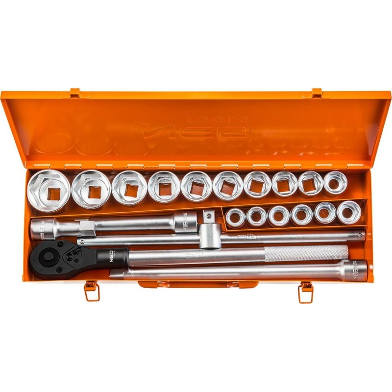 Der professionelle 3/4"-Steckschlüsselsatz im Metallkoffer ist die richtige Wahl für den regelmäßigen Einsatz. Der Satz NEO 08-061 enthält 21 Teile aus hochwertigem Chrom-Vanadium-Stahl. Diese Werkzeuge sind besonders abrieb- und korrosionsbeständig und werden dem Anwender viele Jahre lang gute Dienste leisten.