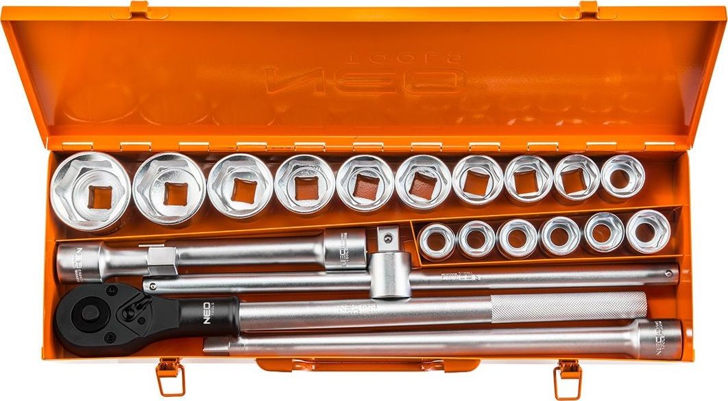 Das Steckschlüsselset NEO 08-061 umfasst 21 Teile, die in einem kompakten und solide gefertigten Koffer untergebracht sind. Metallteile sind wesentlich widerstandsfähiger gegen Beschädigungen als solche aus Kunststoff, weshalb sich dieses Set hervorragend für den professionellen Einsatz eignet. Der Koffer hat eine eckige Form, was das Aufstellen oder Ablegen am Arbeitsplatz sowie das Tragen und Transportieren erleichtert. Im Inneren befinden sich Fächer, die das Ordnen des Inhalts erleichtern. Das Set enthält eine professionelle Ratsche mit langlebigem Ratschenmechanismus, einen Satz 3/4"-Steckschlüsseleinsätze in den Größen 19 bis 50 mm, Verlängerungen und weiteres Zubehör, das im Arbeitsalltag nützlich ist.