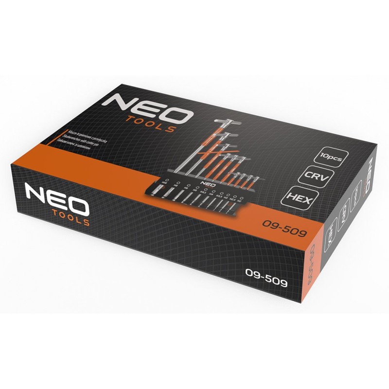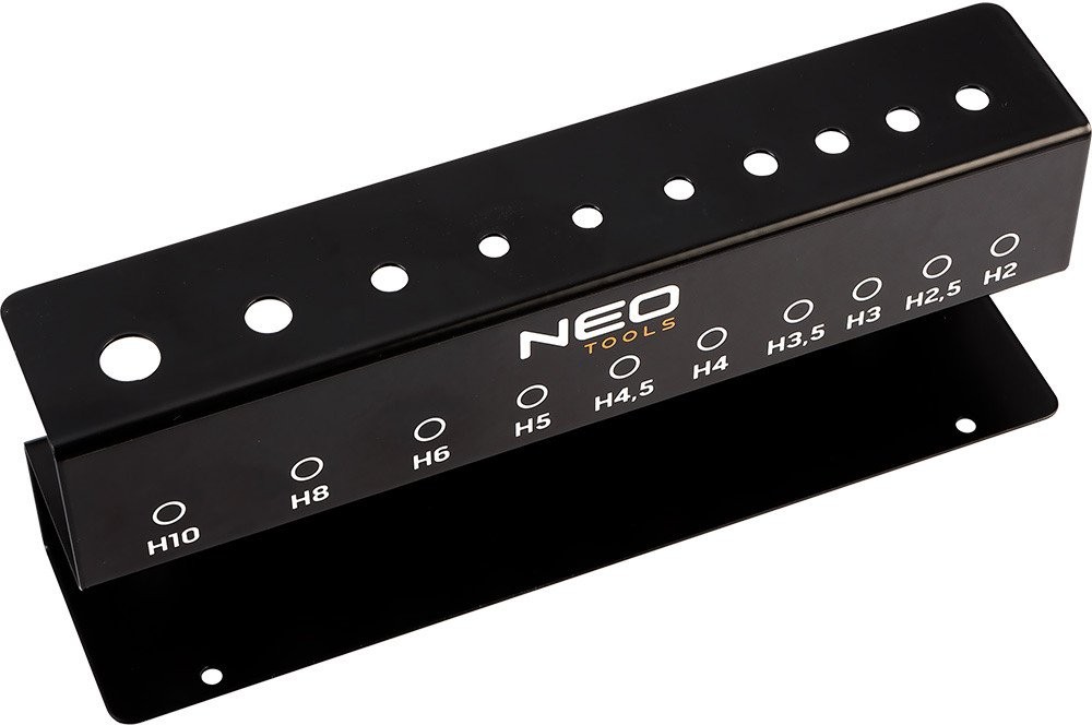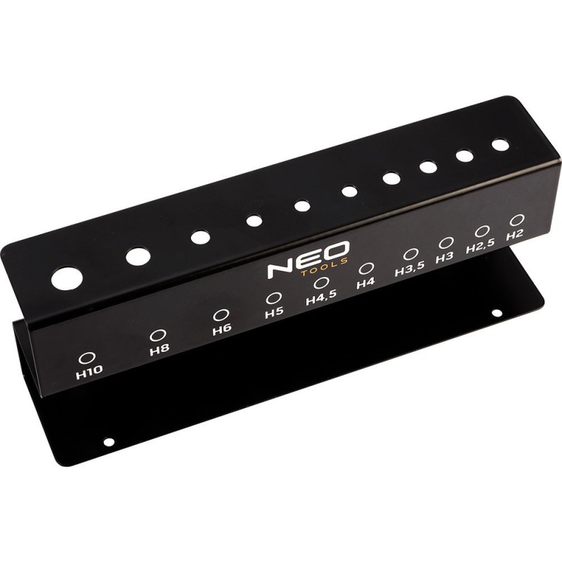 Stiftschlüssel mit Sicherungsstift, 10-teiliges Set in einem Metallständer zum Aufhängen an der Wand; Größen: H2 (125 x 65 mm), H2,5 (125 x 65 mm), H3 (125 x 65 mm), H3,5 (125 x 65 mm), H4 (177 x 90 mm), H4,5 (177 x 90 mm), H5 (181 x 89 mm), H6 (209 x 106 mm), H8 (250 x 122 mm), H10 (300 x 145 mm); Ständer: 220 x 40 x 82 mm; Lochabstand zur Aufhängung: 175 mm; CRV