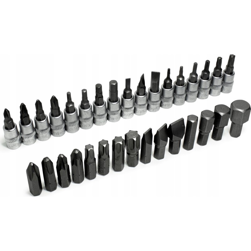 - Steckschlüsseleinsätze: SL 4, 5,5, 7; PH 1, 2; PZ 1, 2; HEX 3, 4, 5, 6; T 8, 10, 15, 20, 25, 30