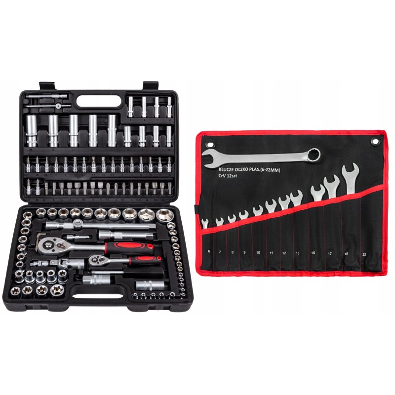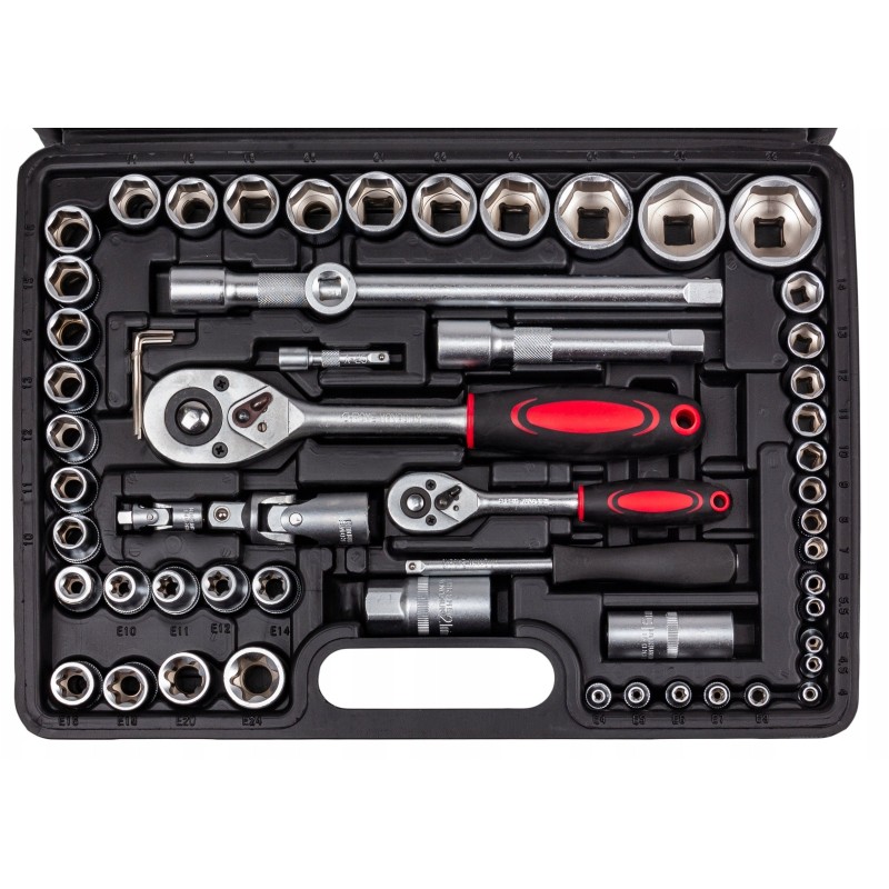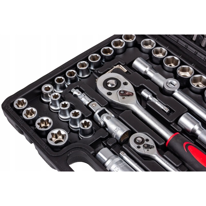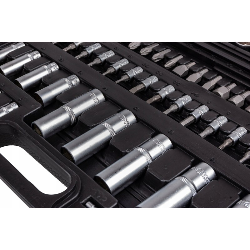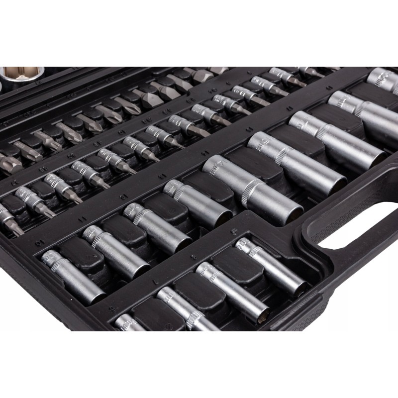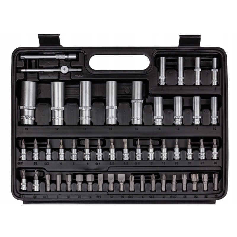 Das Set umfasst verschiedene Steckschlüsseleinsätze, Ratschen und Ring-Maulschlüssel. Es bietet Steckschlüsseleinsätze in verschiedenen Größen, sowohl Standard- als auch Langausführungen, sowie Zündkerzensteckschlüssel. Darüber hinaus enthält das Set Bits in verschiedenen Größen, Adapter, Verlängerungen, Durchsteckhülsen und Inbusschlüssel, was es zu einem kompletten Werkzeug für viele Anwendungen macht.