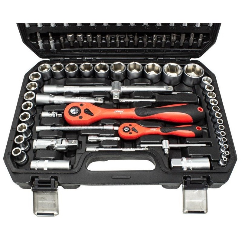 Das 94-teilige Werkzeugset bietet eine große Auswahl an Steckschlüsseleinsätzen und Bits, mit denen sich vielfältige Aufgaben bewältigen lassen. So hat der Anwender alles zur Hand, was er benötigt, um Reparatur- und Montagearbeiten effizient und zügig durchzuführen.