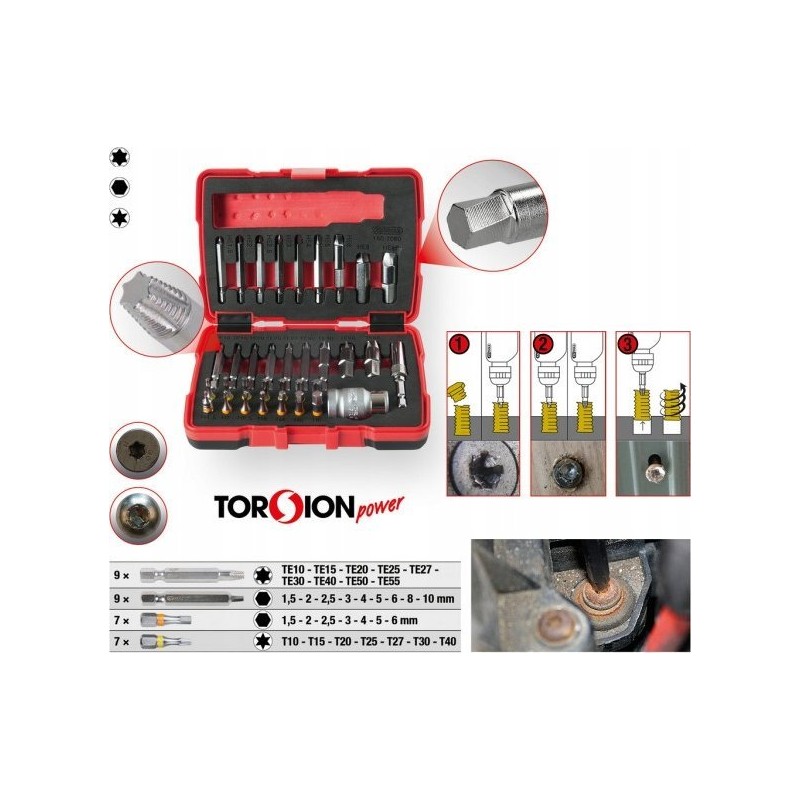 Das Set enthält TORSIONpower-Bits, die über einen speziellen Drehbereich verfügen, wodurch das maximale Drehmoment abgefedert wird. Dadurch wird die Arbeit mit beschädigten Schrauben wesentlich einfacher und sicherer.