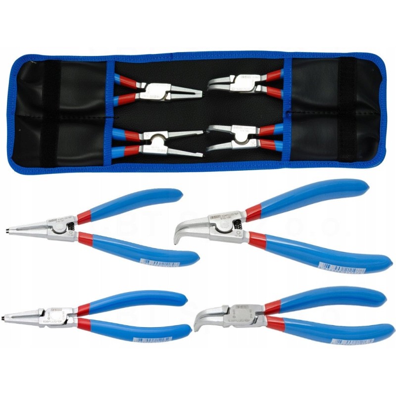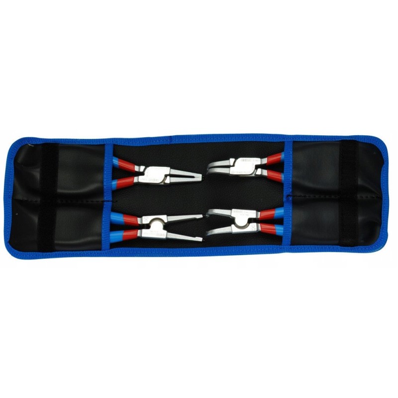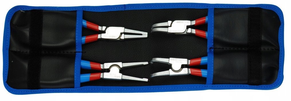 Das Set besteht aus vier Teilen, darunter sowohl Außen- als auch Innenzangen für Seger-Ringe, in gerader und abgewinkelter Ausführung. Diese Auswahl an Werkzeugen macht das Set äußerst funktional und auf die unterschiedlichen Bedürfnisse der Anwender zugeschnitten.