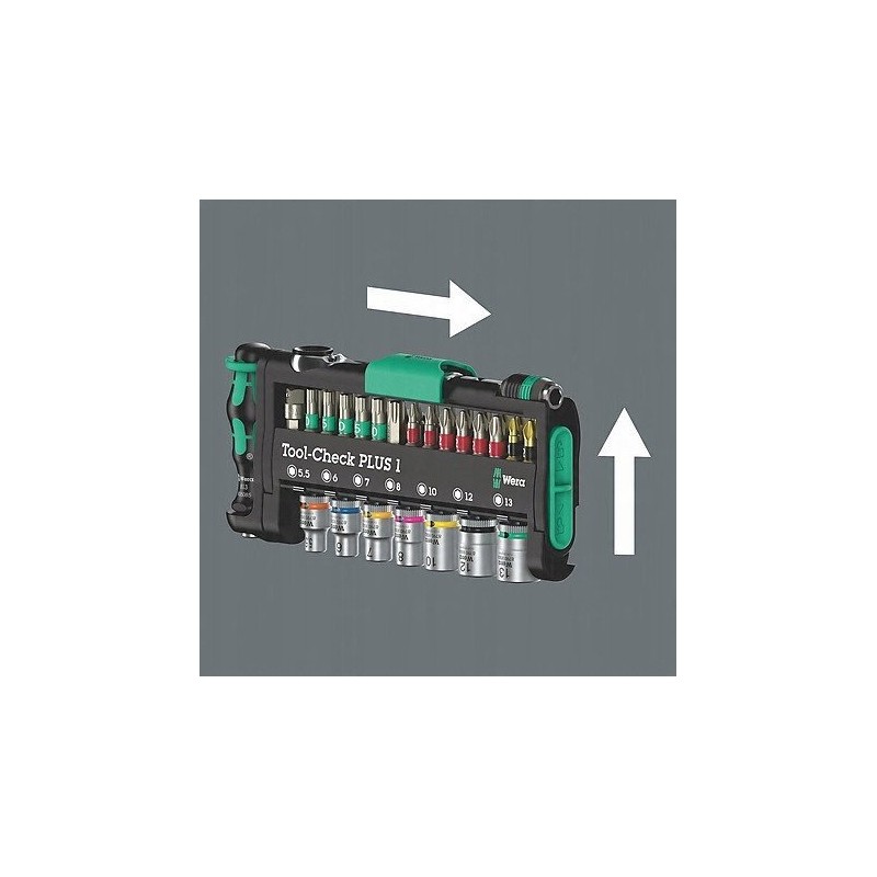 Alle Werkzeuge des Sets sind übersichtlich in einem praktischen Tool-Check-Halter organisiert, der für ihre Sicherheit beim Transport sorgt. Grüne Verriegelungselemente sichern die Werkzeuge zuverlässig, was einen einfachen Transport und eine einfache Aufbewahrung ermöglicht.