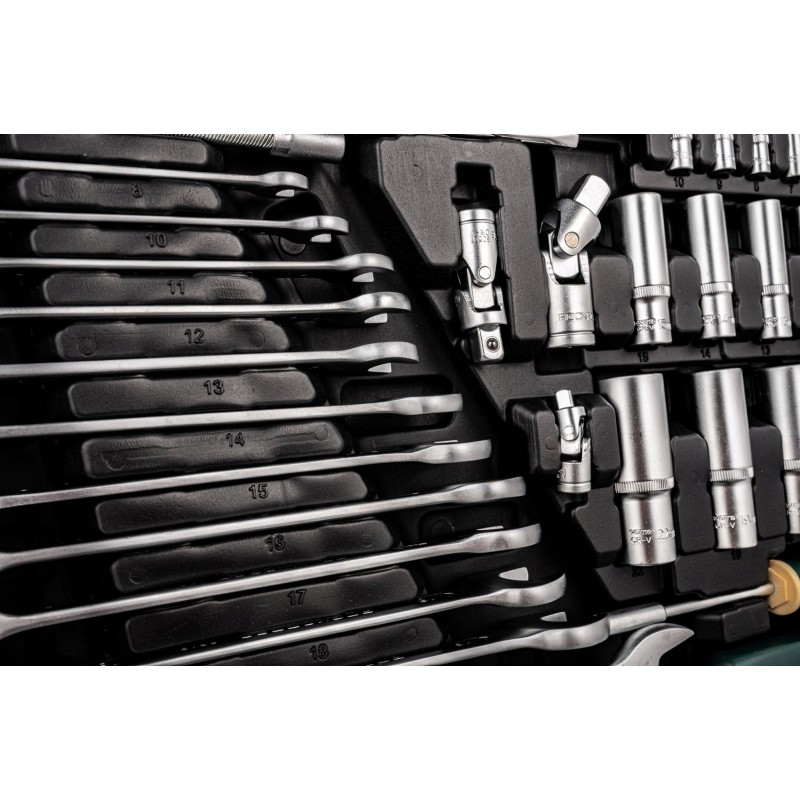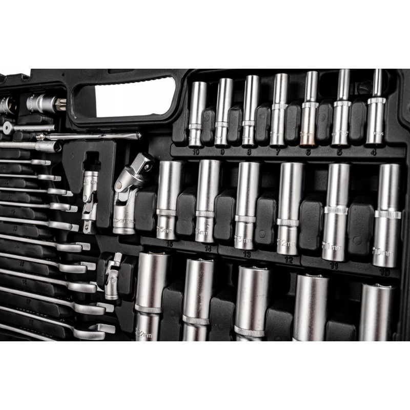 Das Set enthält eine große Auswahl an Werkzeugen, darunter kurze und lange Steckschlüsseleinsätze in den Größen 1/4", 3/8" und 1/2", sowie Bits, Verlängerungen, Kardangelenke und Ring-Maulschlüssel. Dank dieser Vielfalt eignet sich das Set hervorragend für verschiedene Projekte, von einfachen Reparaturen bis hin zu komplexeren Aufgaben.