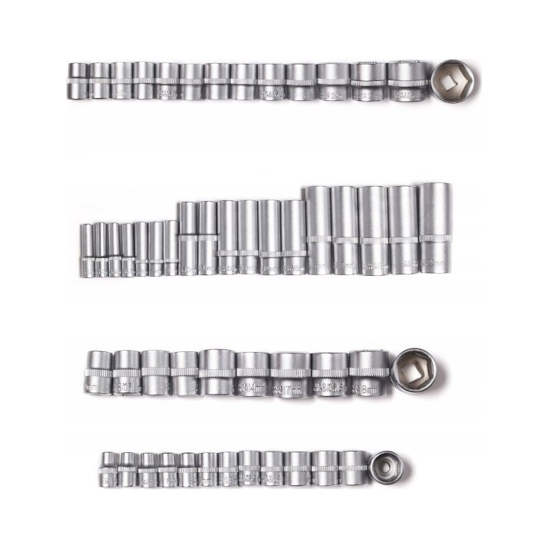 - Anzahl der 3/8"-Steckschlüsseleinsätze: 10 kurze, 6 lange, 6 Typ E