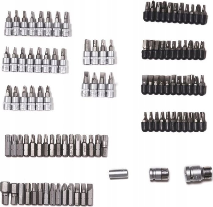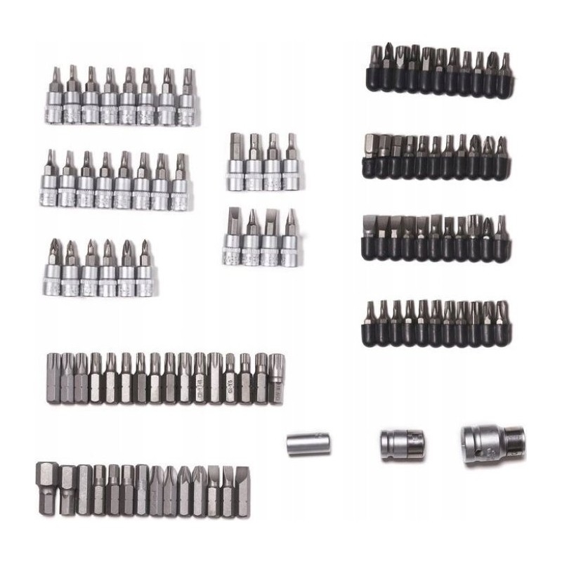 - 1/2": 14 kurze Steckschlüsseleinsätze, 5 lange Steckschlüsseleinsätze, 3 E-Steckschlüsseleinsätze, Bitadapter, 2 Verlängerungen, 2 Zündkerzensteckschlüsseleinsätze, Kardangelenk, Ratsche, 2 Schraubendrehereinsätze, 7 Inbusschlüssel, 12 Ring-Maulschlüssel sowie 30 Bits.