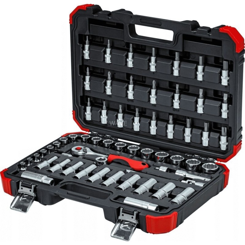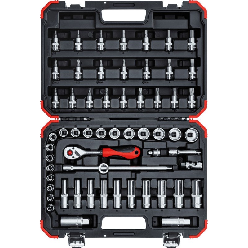Lieferumfang: Koffer (Kunststoff), 59-teiliges Zubehörset, 1x Ratsche, 2x Verlängerung