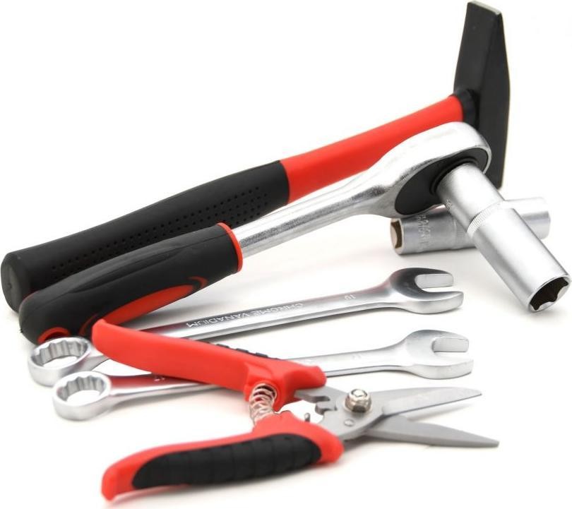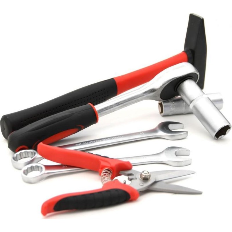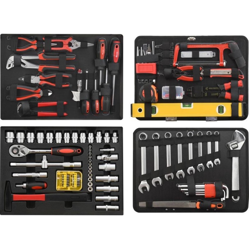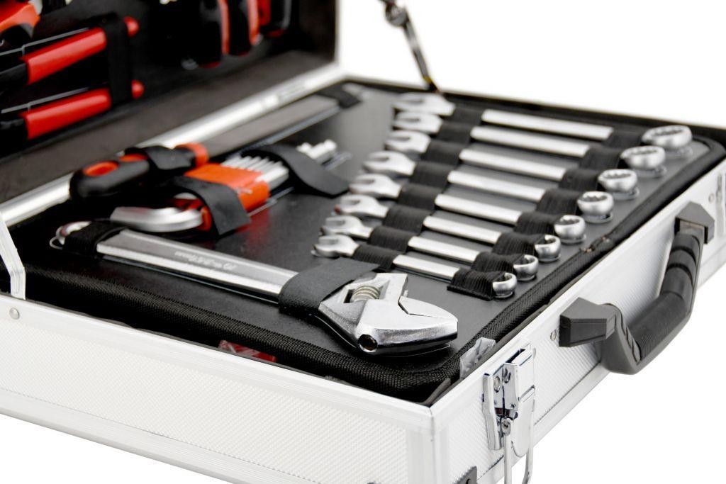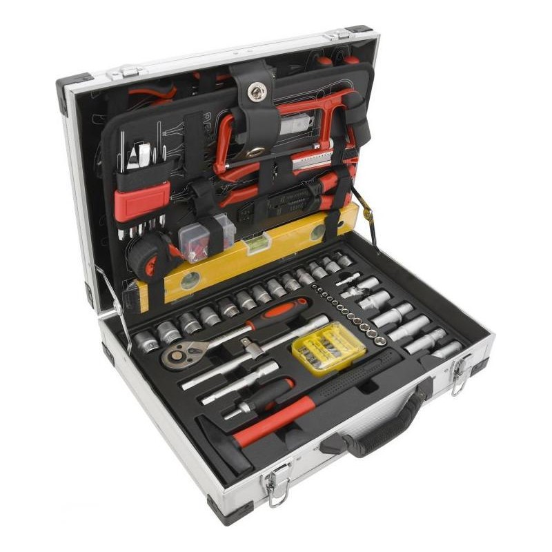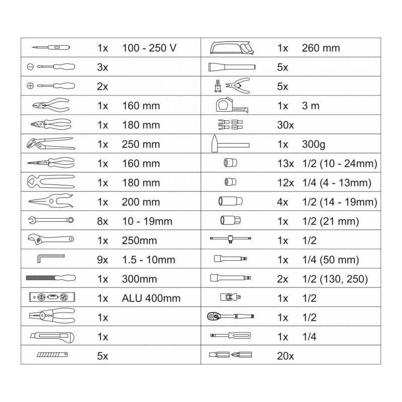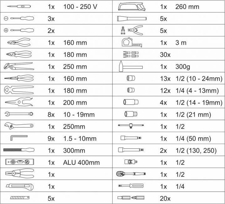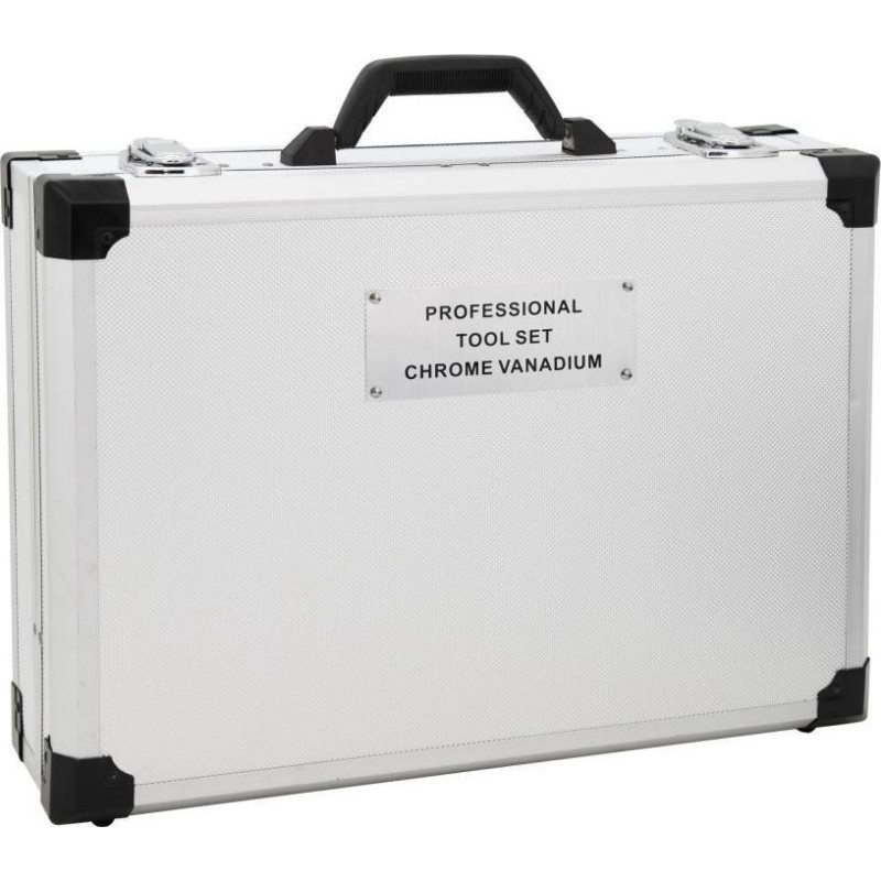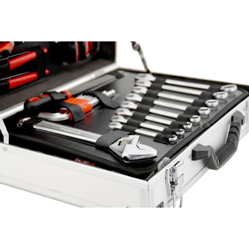 Tragbarer Koffer, ausgestattet mit exklusiven CR-V-Werkzeugen, darunter Ring-Maulschlüssel, Wasserwaage und weitere Werkzeuge, die in festgelegten Positionen auf insgesamt 4 Einsätzen angeordnet sind. Der Boden des Koffers ist mit einer Ratsche mit 45-Zahn-Mechanismus sowie deren Zubehör und Accessoires ausgestattet, ebenso wie mit einem Hammer und einem Ratschenschraubendreher samt Bits. Der obere Teil des Gehäuses ist mit Schraubendrehern verschiedener Größen ausgestattet, darunter ein Testgerät für Elektriker. Außerdem befinden sich dort die am häufigsten verwendeten Zangen, darunter Kombizangen, Spalt- und Schneidezangen. Zwischen Boden und Deckel befindet sich eine fest eingeklemmte doppelseitige Platte mit Kombischlüsseln, einem Einstellschlüssel, einer Feile und einem Inbusschlüssel auf der einen Seite. Auf der anderen Seite befinden sich eine Wasserwaage, ein Messgerät, ein Messer mit Ersatzklingen, eine Säge, Stempel, Seger-Zangen und Zangen für Elektriker, einschließlich Steckverbinder.