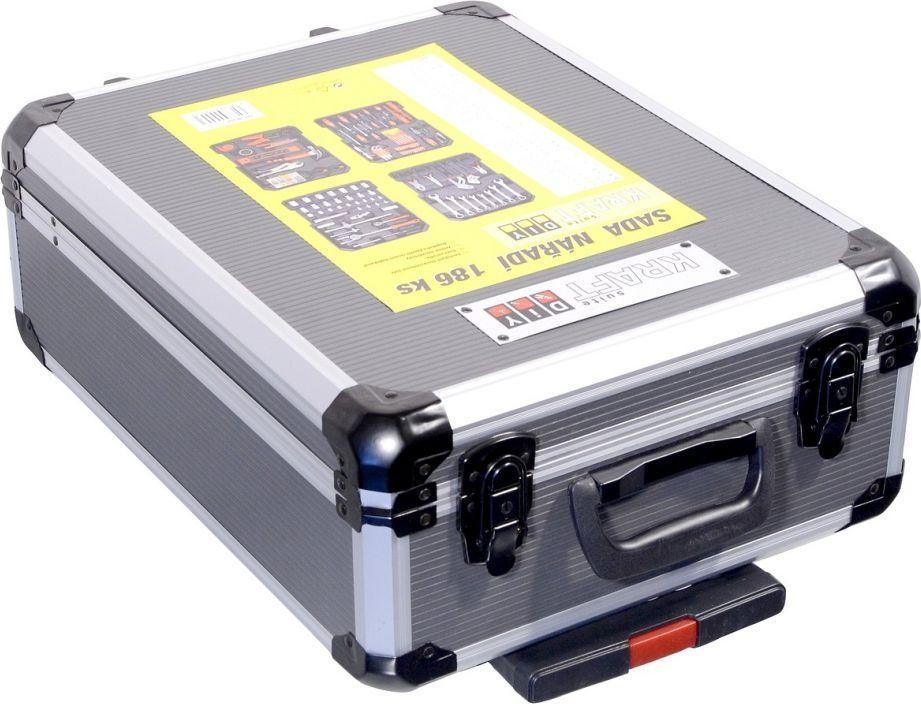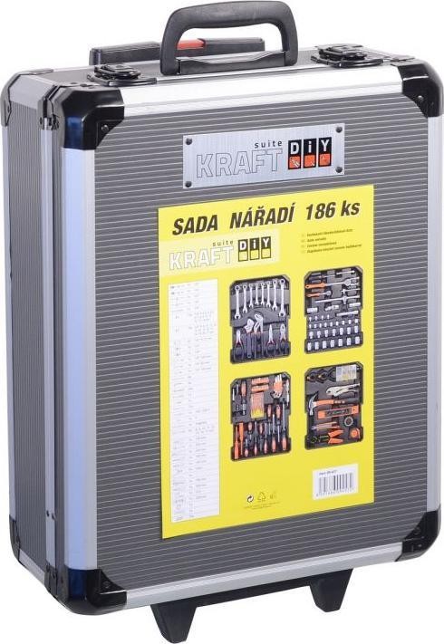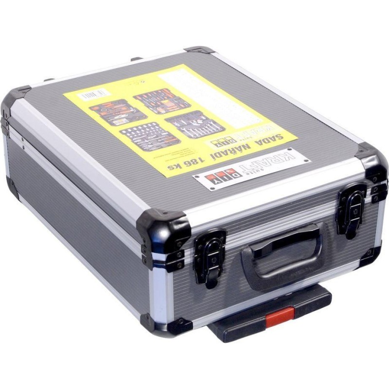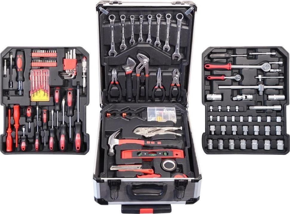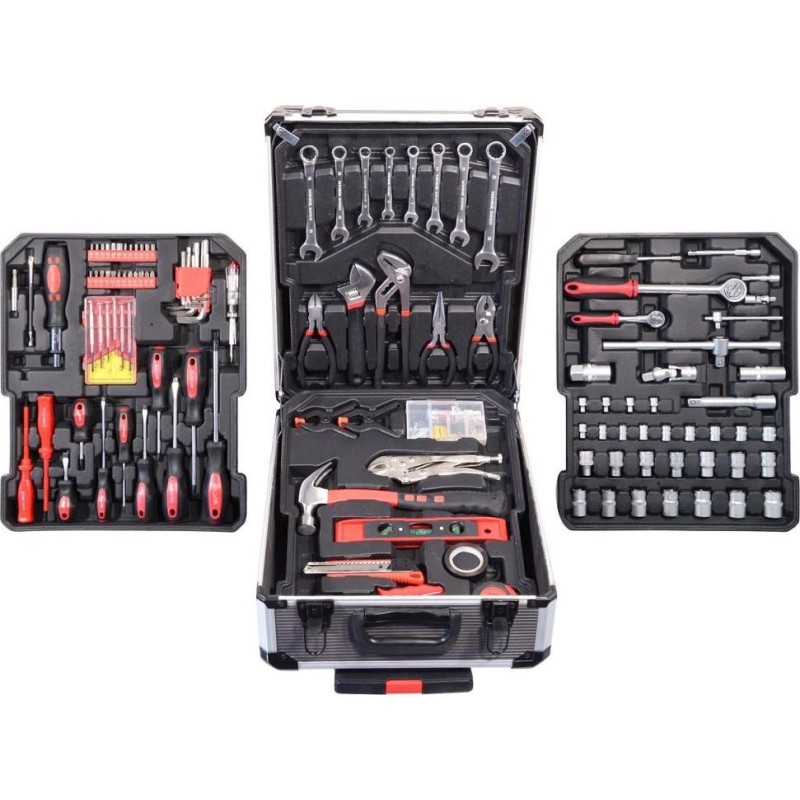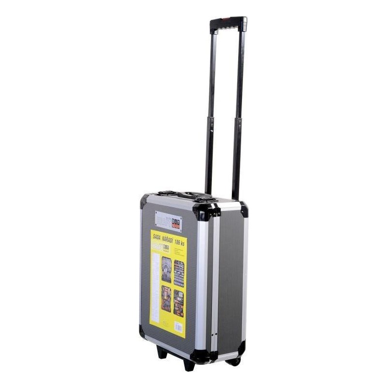 Der Koffer ist mit einem Teleskopgriff und Rollen ausgestattet, was die Handhabung des gesamten Werkzeugsatzes erleichtert. Das Set enthält verschiedene Zangen, Schraubendreher, Schraubenschlüssel, einen Hammer, eine Wasserwaage, Seiten- und Sechskantschlüssel, Bits, Befestigungselemente für den Sockel und viele weitere Werkzeuge, die sich für den Einsatz zu Hause, in der Garage sowie unterwegs eignen.