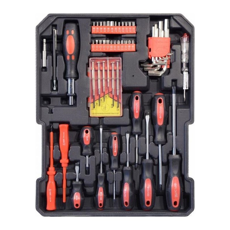 6x Uhrmacherschraubendreher 9x Inbusschlüssel 24-teiliger Bit-Satz (flach, Kreuz, Stern, Vierkant) 1x Bit-Schraubendreher 1x Bit-Halter (Sechskant) 11-teiliger Schraubendreher (Kreuz, flach) 1x Spannungsprüfer 100–250 V 1x magnetischer Teleskopabzieher