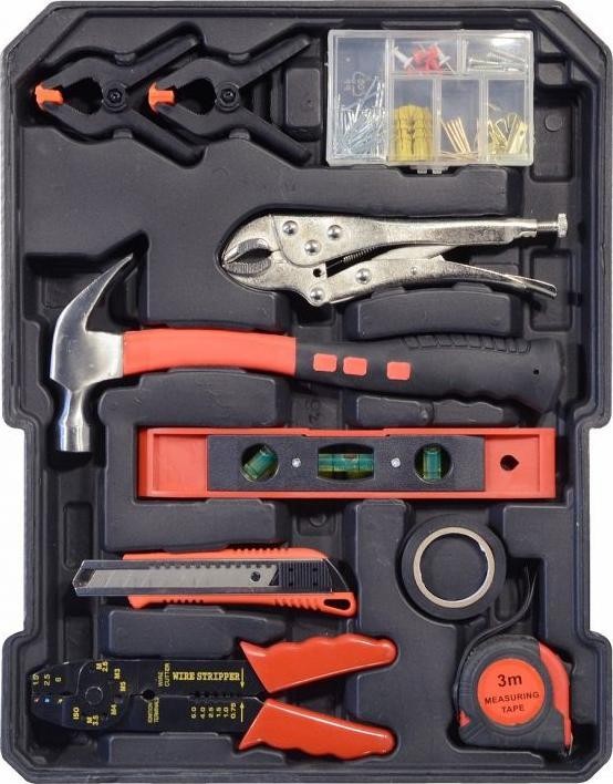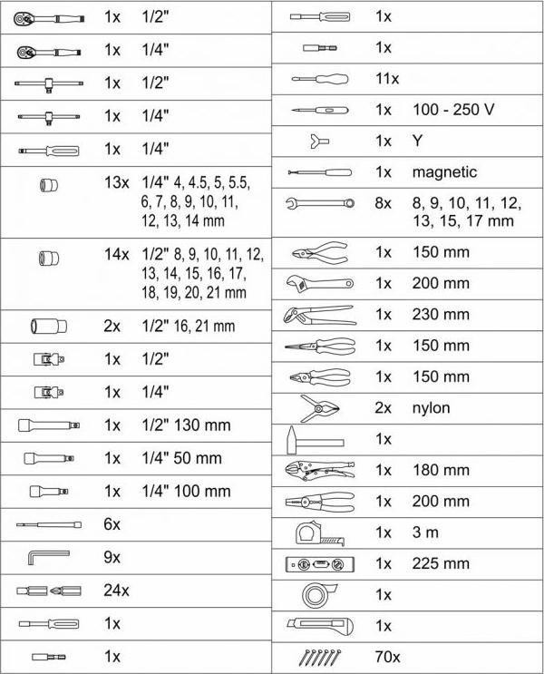 2x Nylon-Universalklemme 1x Hammer 1x selbstsichernde Zange 180 mm 1x Verbindungszange 200 mm 1x Maßband 3 m 1x Wasserwaage 220 mm 1x Isolierband 1x Messer 70x Verbindungselemente