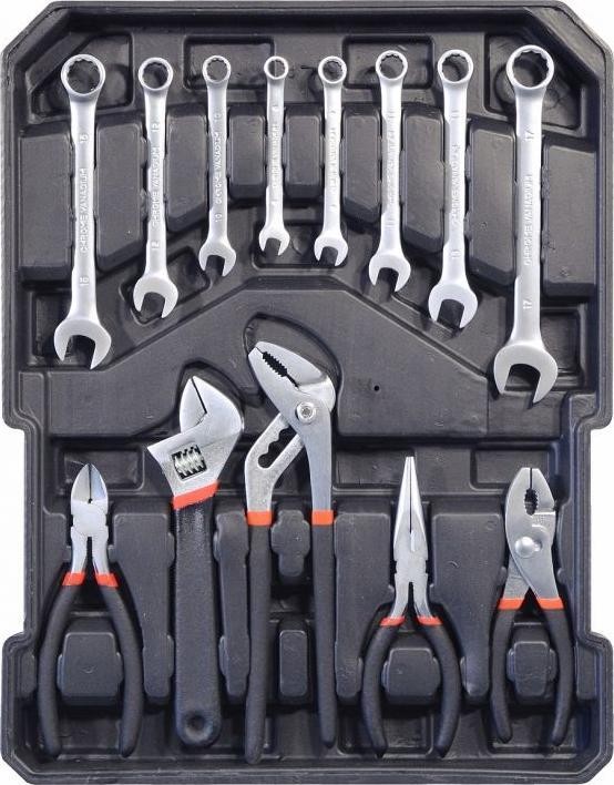 Zangen 1x 150 mm 1x Verstellschlüssel 200 mm 1x Zange 230 mm 1x Zange 150 mm 1x Universalzange 150 mm 8x Kombischlüssel (8, 9, 10, 11, 12, 13, 15, 17)
