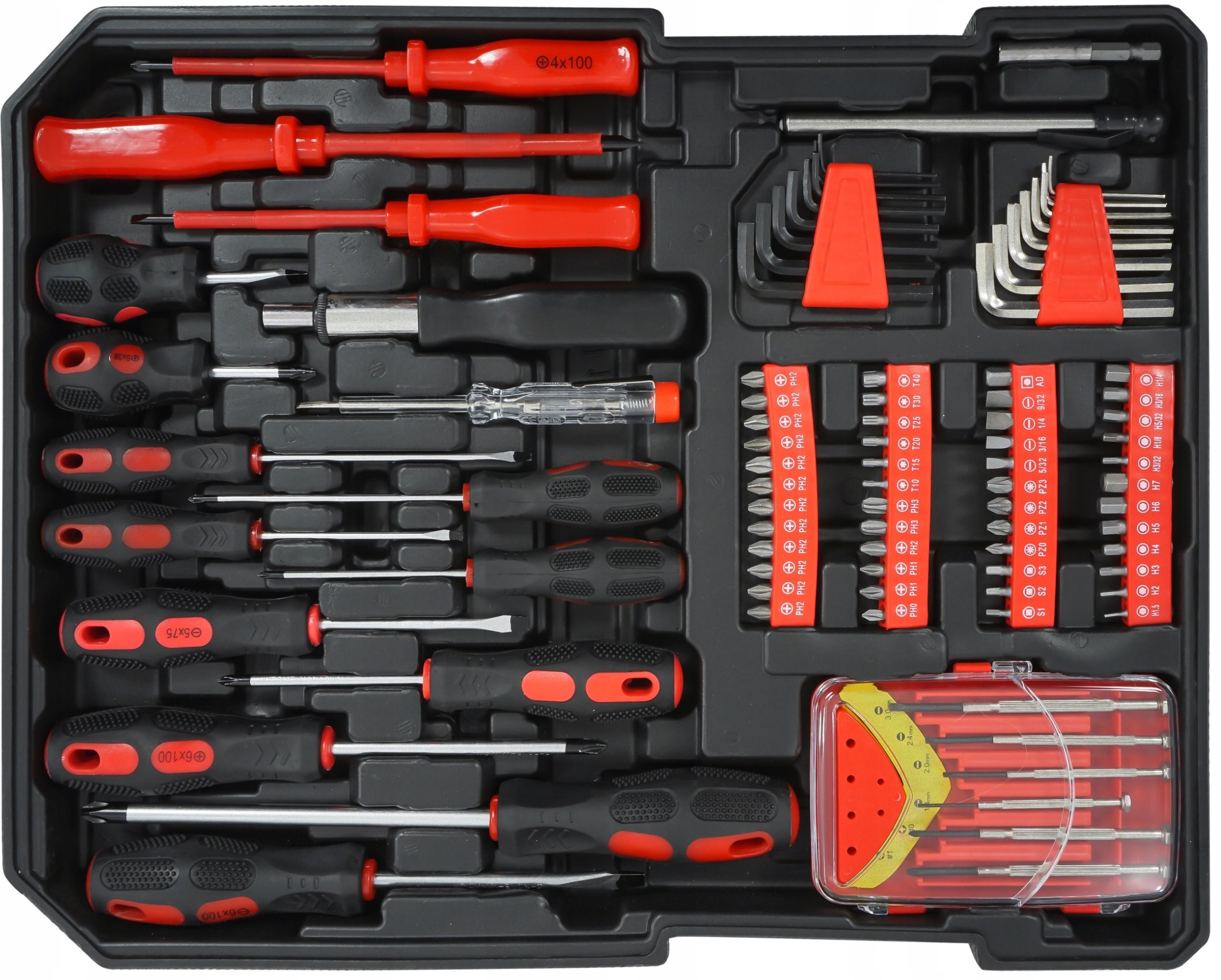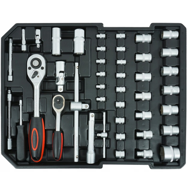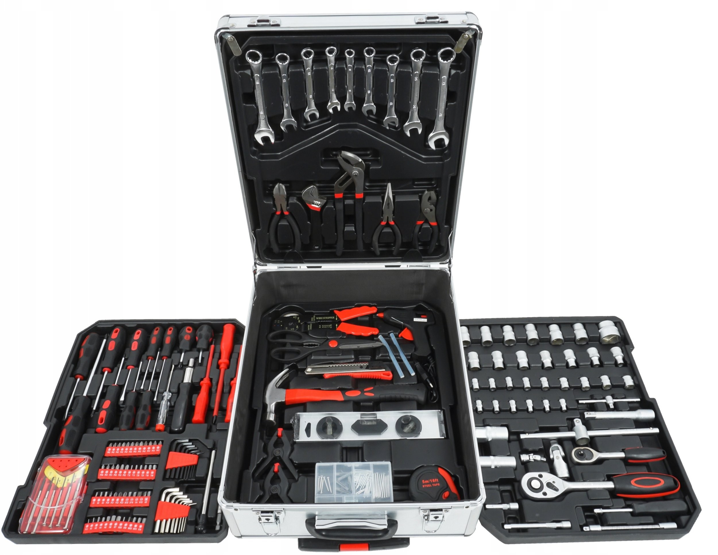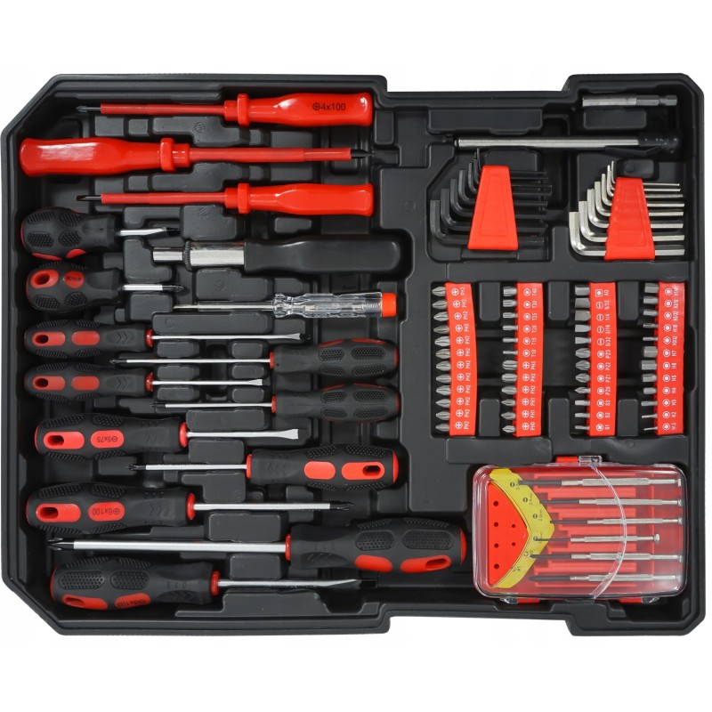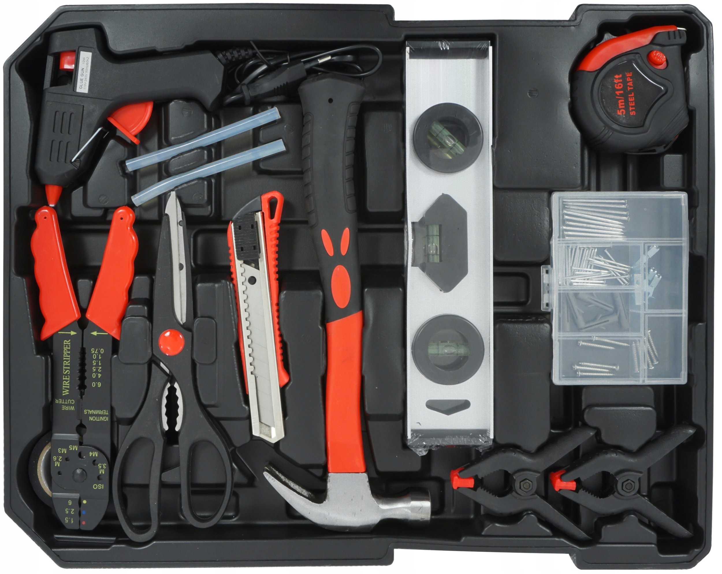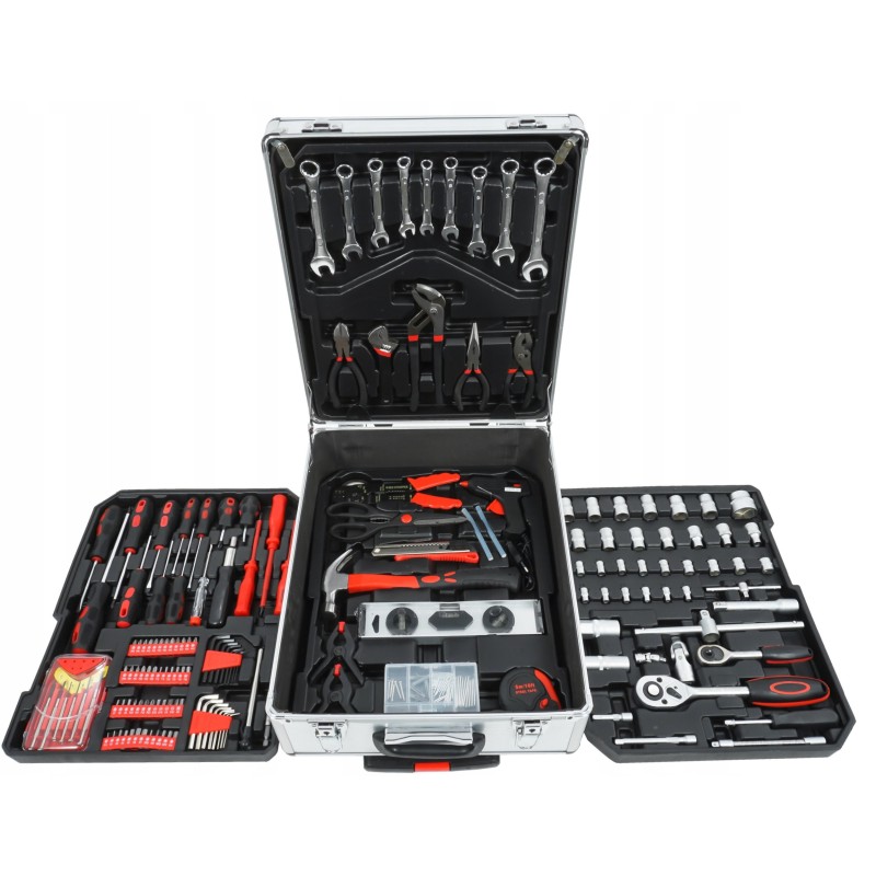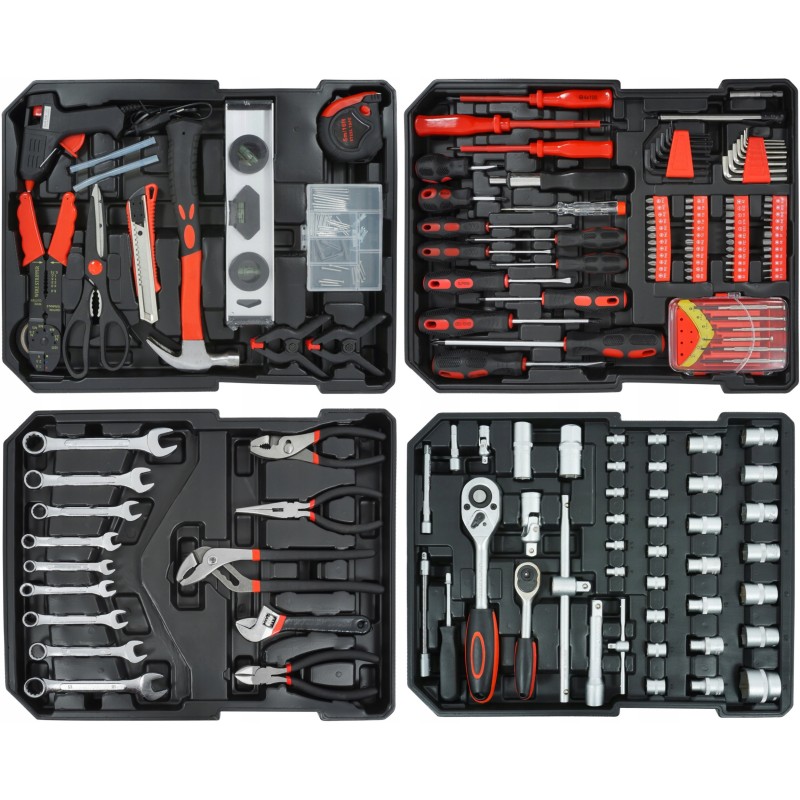 - Set-Inhalt: Ratschen, Steckschlüsseleinsätze, Schraubenschlüssel, Schraubendreher, Zangen, Wasserwaage, Klebepistole, Schere, Hammer, Isolierband usw.