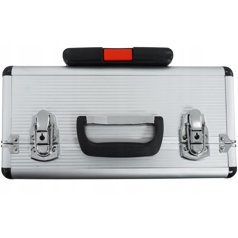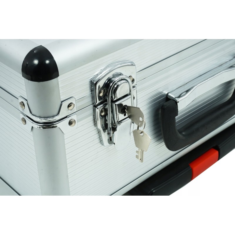 Der Koffer des Sets ist mit Schlüsselverschlüssen ausgestattet, die Schutz vor dem Zugriff durch Kinder und vor dem versehentlichen Herausfallen von Teilen bieten. So können Sie sicher sein, dass Ihre Werkzeuge immer an einem sicheren Ort aufbewahrt werden.