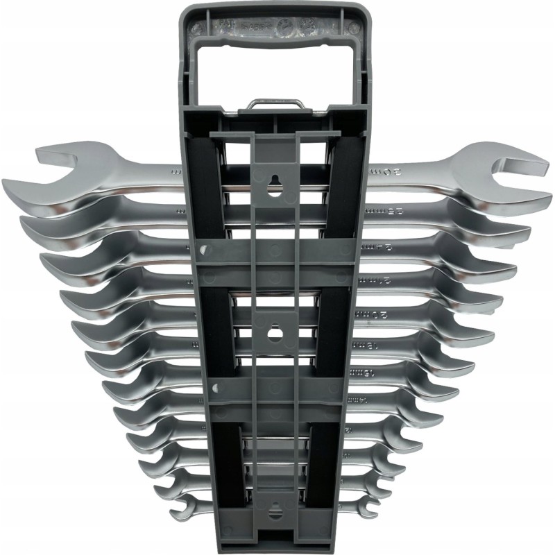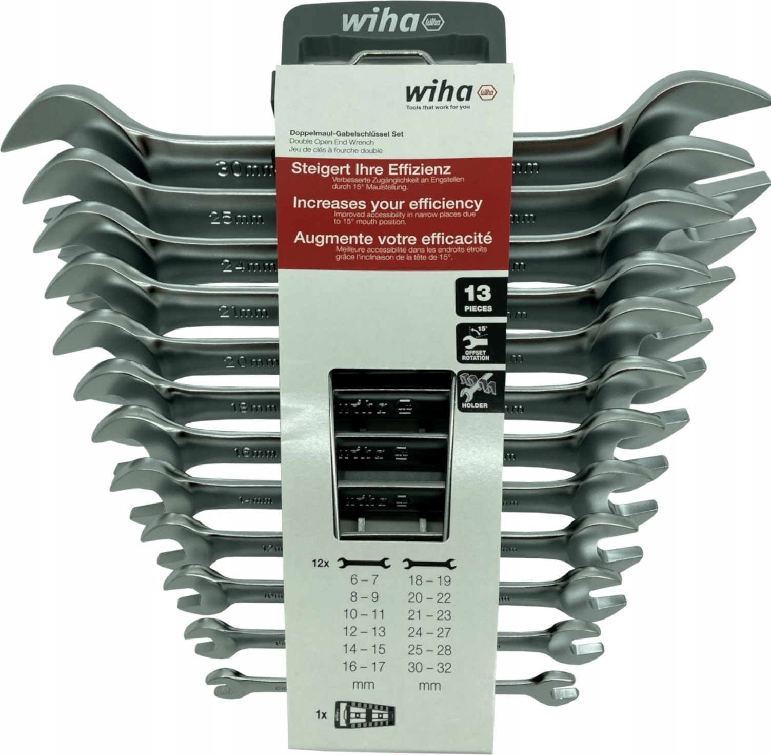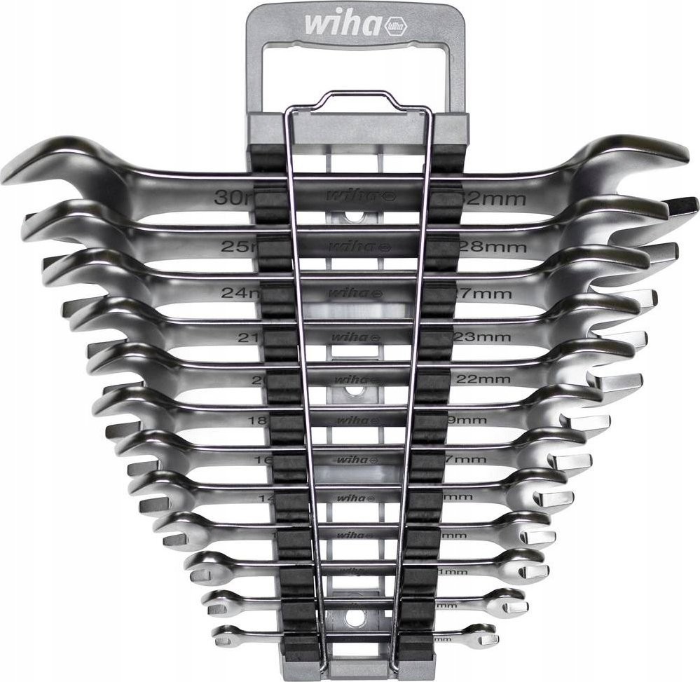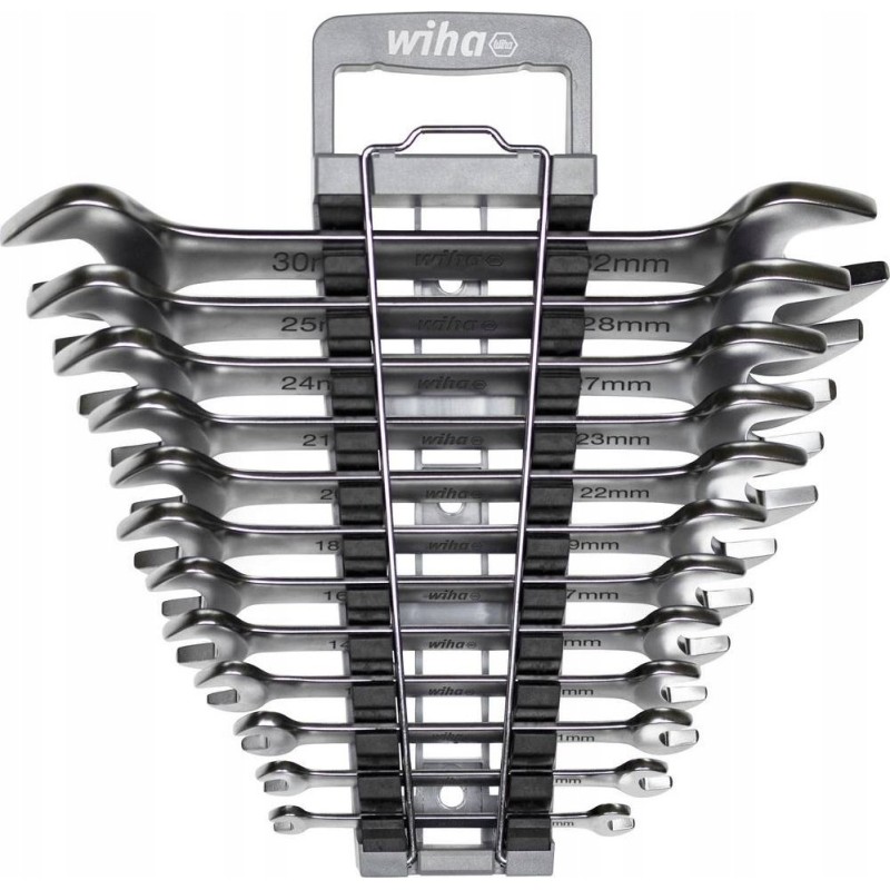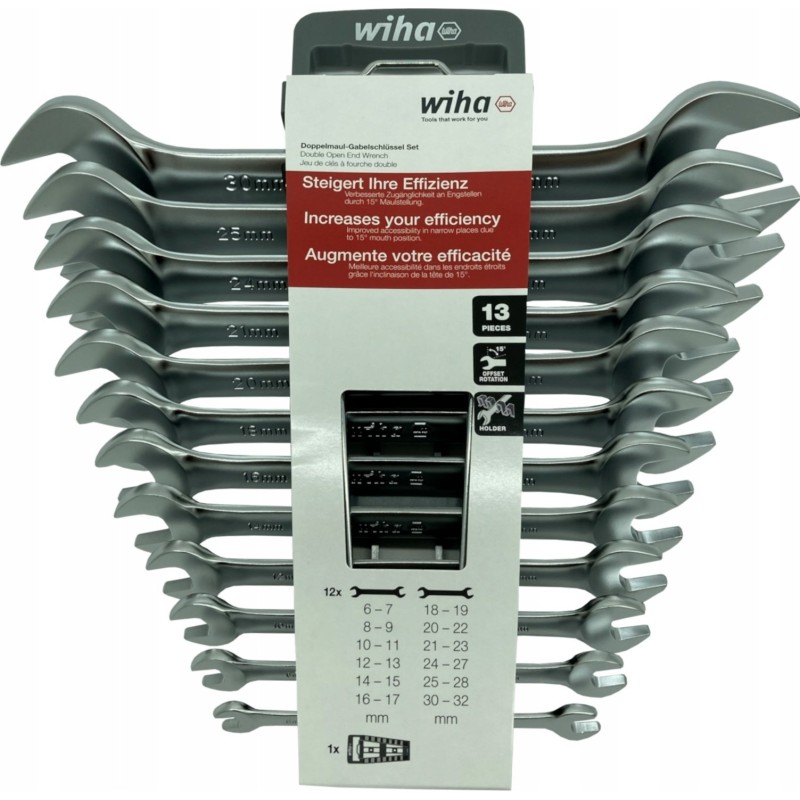 Das Lösen festgezogener Schrauben erfordert enorme Kraft. Mit den doppelseitigen Schraubenschlüsseln von Wiha lassen sich dank des erhöhten Hebeleffekts alle Schraubverbindungen mühelos lösen. Durch die schräge Anordnung der Backen eignen sich die doppelseitigen Flachschlüssel optimal für Arbeiten an engen Stellen. Zudem eignen sie sich hervorragend zum Anziehen und Lösen von Schrauben und Muttern. Die aus hochwertigem Chrom-Vanadium-Stahl gefertigten doppelseitigen Flachschlüssel garantieren Langlebigkeit und Robustheit. Ihre korrosionsbeständige und leicht zu reinigende Oberfläche trägt zu einer langen Lebensdauer bei. Das Set enthält die 12 gängigsten Größen von 6 bis 32 mm, die praktisch in einem handlichen Halter aufbewahrt werden. Der Halter lässt sich mit einer Hand öffnen, um die passende Größe zu entnehmen, und die rutschfeste Oberfläche sorgt für einen sicheren Halt auch bei verschwitzten oder nassen Arbeitsbedingungen.