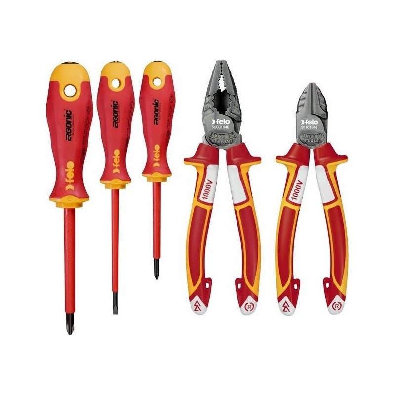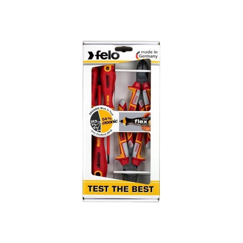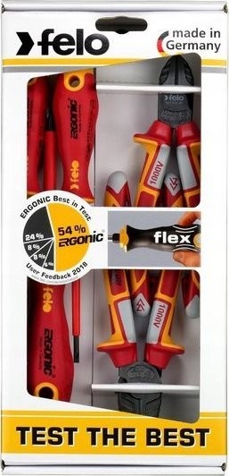 Felo-Werkzeugset Set mit 3 FELO-Schraubendrehern – ERGONIC VDE 4,0/PH1/PH2 + VDE-Seitenschneider 160 / VDE-Zange 180 + Magnet