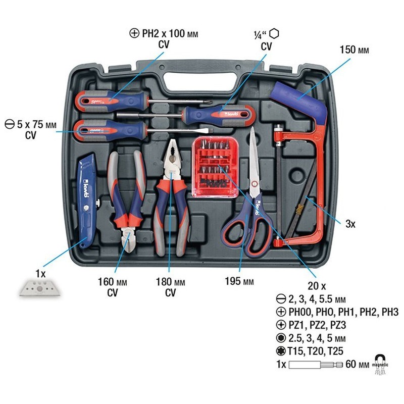 65 Teile. Der Werkzeugkoffer bietet eine große Auswahl an Werkzeugen. Ideal als Basisausstattung für die Werkstatt in einem praktischen Kunststoffkoffer für den Einsatz unterwegs