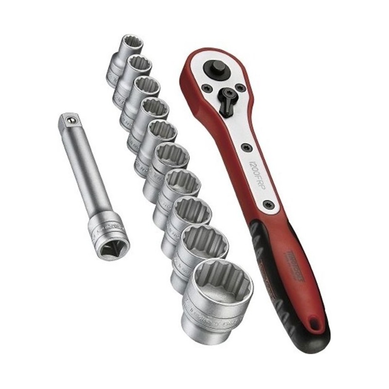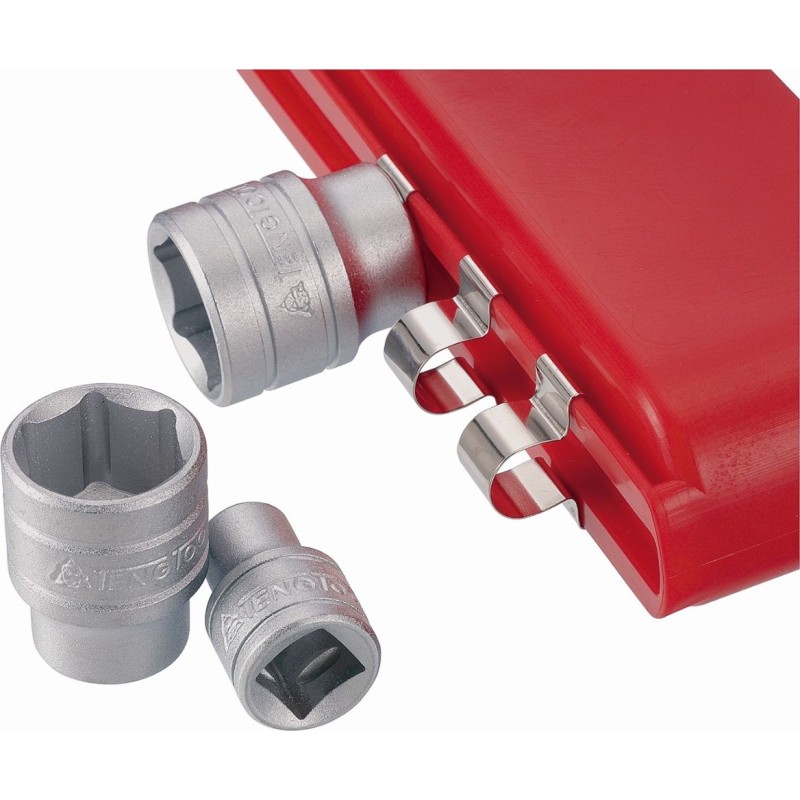 13-teiliges 1/4"-Steckschlüsselset in einem kompakten Kunststoffkoffer. Enthält eine glasfaserverstärkte Ratsche, eine Verlängerung und 11 Steckschlüsseleinsätze. An der Außenseite des Koffers können Federhalterungen zur Aufnahme zusätzlicher Steckschlüsseleinsätze befestigt werden.
