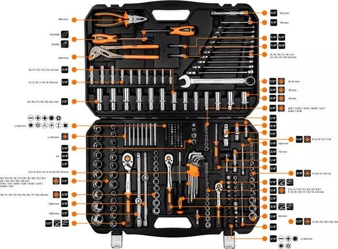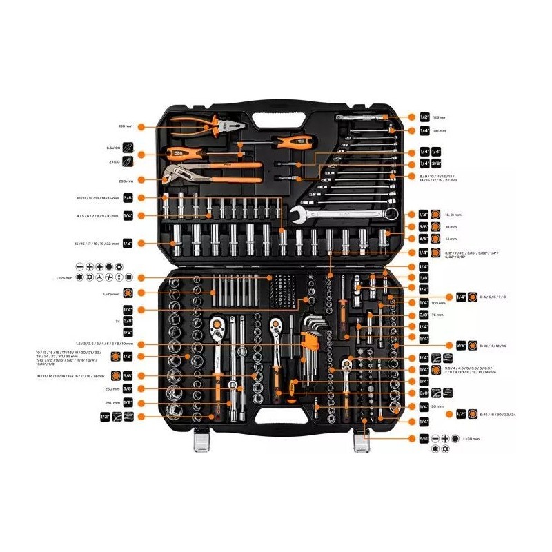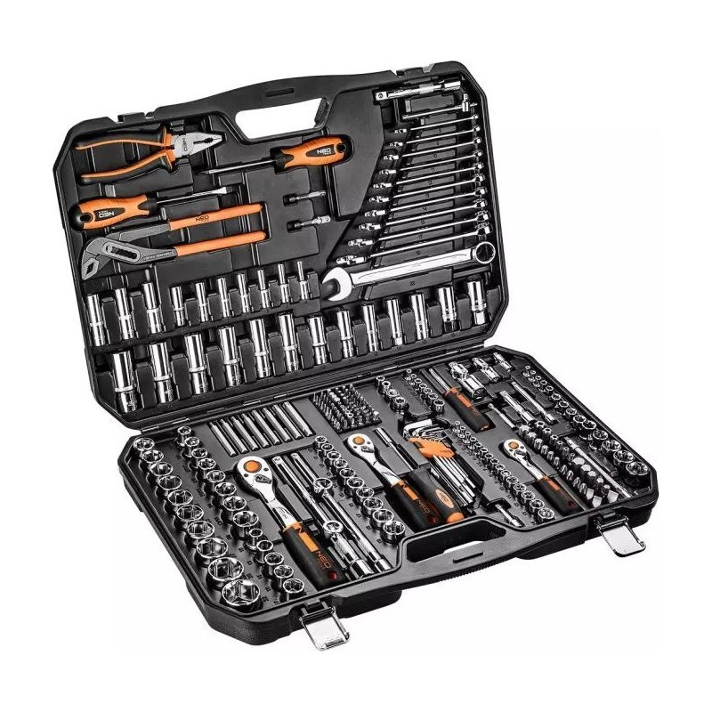 Das umfassendste Set hochwertiger Steckschlüssel in den Größen ½”, ¼” und 3/8”, das ganze 233 (!) Werkzeuge und Zubehörteile der Marke NEO enthält. Die Produkte werden in einem praktischen Kunststoffkoffer mit Metallverschlüssen und einem handlichen Griff angeboten. Zudem ist das Innere der Verpackung mit einer speziellen Einlage ausgekleidet, die für Ordnung sorgt und den Inhalt vor Beschädigungen schützt.