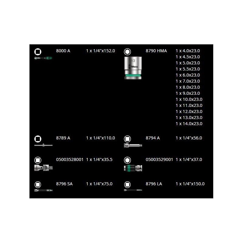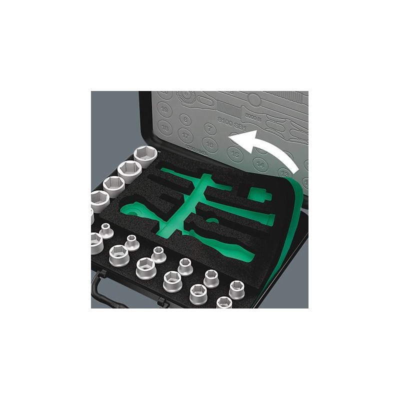 - Für Steckschlüssel und Adapter mit 1/4"-Vierkantaufnahme, mit Kugelrastung. 13 Zyklop-Steckschlüssel, metrisch, 2 Zyklop-Verlängerungen mit Drehhülse, 1 Wobble-Verlängerung, 1 T-Handgriff, 1 Kardangelenk, 1 Adapter mit Schnellspannmechanismus, 22 Bits. Mit dem Werkzeugsuchsystem „Take it easy“: farbige Größenkennzeichnung.
