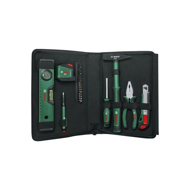 Das 25-teilige Bosch Universal-Handwerkzeugset ist gut ausgestattet und ermöglicht die Durchführung zahlreicher Reparaturen, Heimwerkerarbeiten, Wartungs- und Dekorationsarbeiten zu Hause oder unterwegs. Das Werkzeugset enthält eine Zange, einen Universalschraubendreher, einen 300-g-Handhammer, ein Klappmesser, ein 3-m-Maßband, eine 25-cm-Taschenwasserwaage, einen Tieflochmarkierer sowie 18 Schraubendreherbits in verschiedenen Größen. Die Werkzeuge wurden aus hochwertigen Materialien gefertigt und gewährleisten Robustheit sowie eine lange Lebensdauer. Ergonomische Eigenschaften, wie z. B. Softgrip-Griffoberflächen und abgerundete Formen, garantieren optimalen Bedienkomfort.
