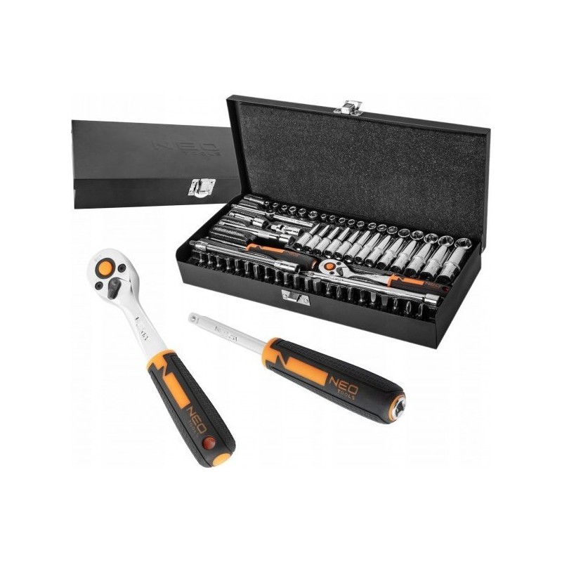 Der 63-teilige Steckschlüsselsatz 10-008 NEO ist ein hochwertiger Werkzeugsatz, der in einem robusten Metallkoffer mit praktischem Verschluss und geprägtem Logo angeboten wird. Zusätzlich ist die Verpackung mit einer speziellen Schaumstoffeinlage ausgekleidet, die für Ordnung sorgt und die einzelnen Teile vor Beschädigungen schützt.