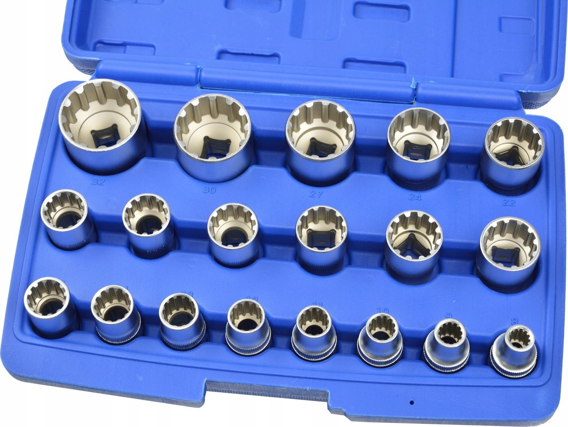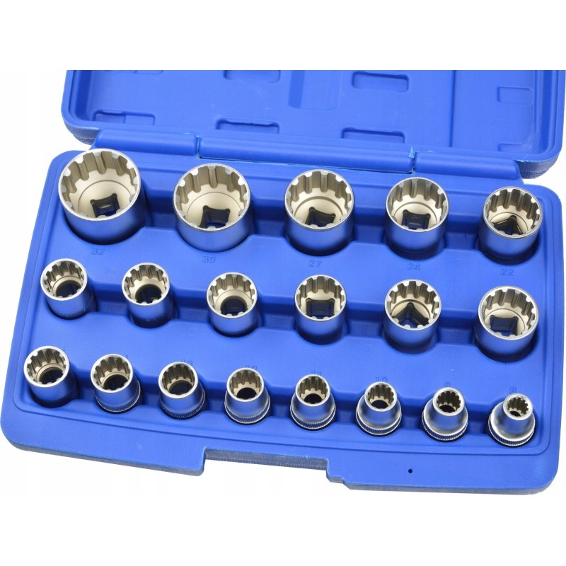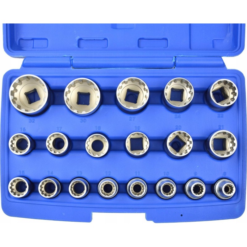- 12-Kant-Steckschlüsseleinsätze: 8, 9, 10, 11, 12, 13, 14, 15, 16, 17, 18, 19, 20, 21, 22, 24, 27, 30, 32 mm