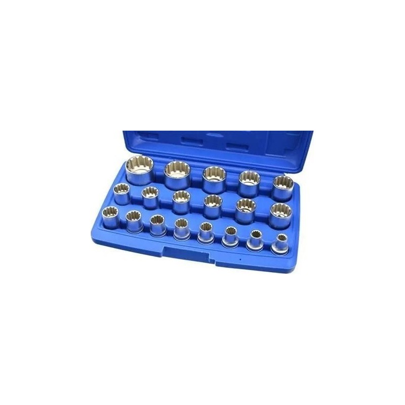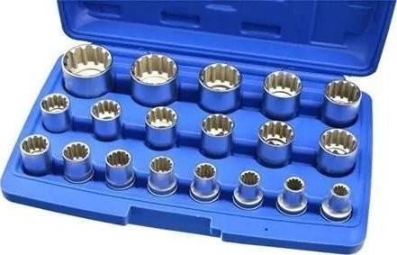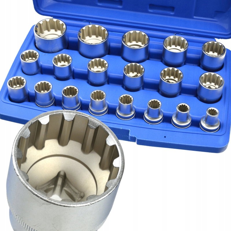 Ein Set einzigartiger 12-Kant-Steckschlüsseleinsätze mit Gear-Lock-Profil. Die Steckschlüsseleinsätze dienen zum Lösen verschiedener Schraubentypen: Sechskantschrauben, Zwölfkantschrauben, Schrauben mit Torx-E-Profil sowie Zollschrauben. Die Steckschlüsseleinsätze sind aus strapazierfähigem Chrom-Vanadium-Legierungsstahl gefertigt.