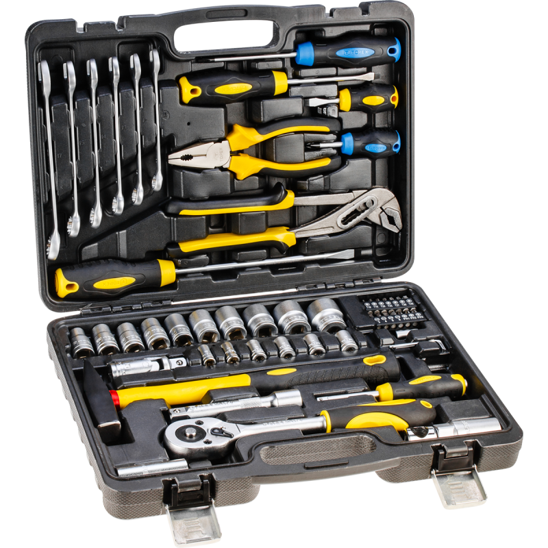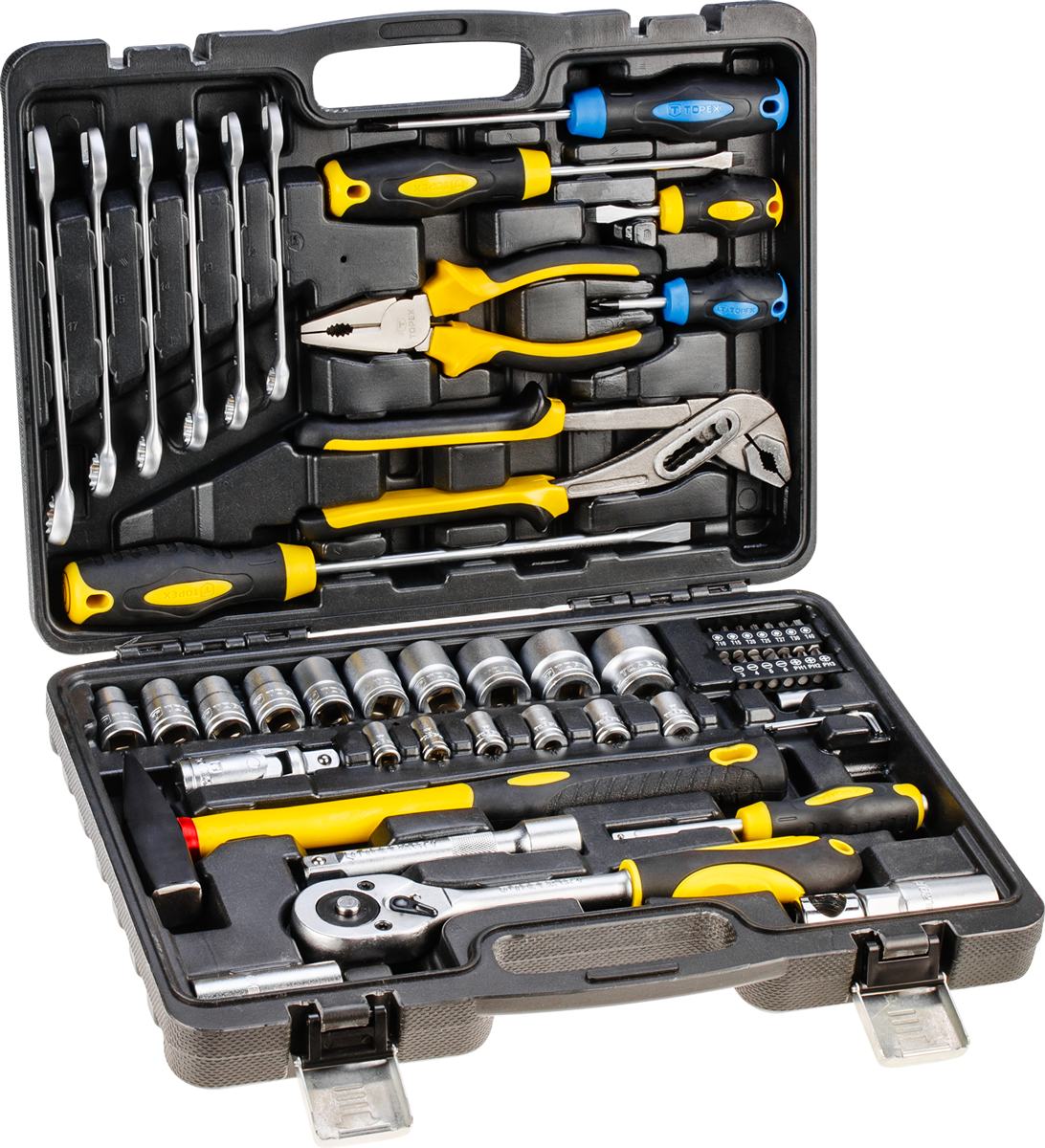 Der TOPEX-Werkzeugsatz besteht aus 56 Teilen, die in einem praktischen Kunststoffkoffer untergebracht sind. Alle Teile zeichnen sich durch eine hohe Verarbeitungsqualität aus. Das Set enthält grundlegende Werkzeuge wie eine 1/2"-Ratsche, Schraubendreher, Zangen, einen 300 g schweren Hammer, Ring-Maulschlüssel, Steckschlüsseleinsätze und Bits. Das Set ist vielseitig einsetzbar für kleinere Montagearbeiten, Reparaturen an Fahrzeugen und Maschinen sowie andere Arbeiten im Haus und in der Garage jedes Heimwerkers. Die Marke TOPEX richtet sich an Heimwerker.