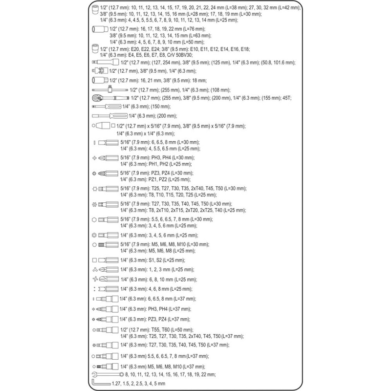 - Steckschlüsseleinsätze 1/4": 4; 4,5; 5; 5,5; 6; 7; 8; 9; 10; 11; 12; 13; 14 mm,