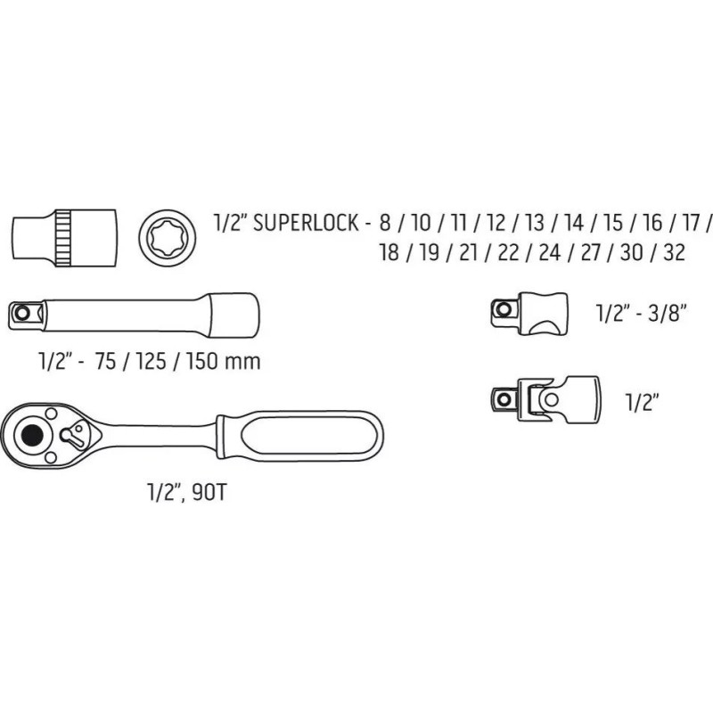 Die wichtigste Aufgabe von Schraubenschlüsseln ist das Lösen und Anziehen von Schrauben in verschiedenen Winkeln. Je mehr Werkzeuggrößen verfügbar sind, desto mehr Aufgaben können Sie damit erledigen. Das NEO-Set enthält ganze 17 1/2"-Sechskant-Steckschlüsseleinsätze in den Größen von 8 bis 32 mm, die das beste ergänzende Zubehör darstellen. Dies sorgt für die Vielseitigkeit der verfügbaren Teile.