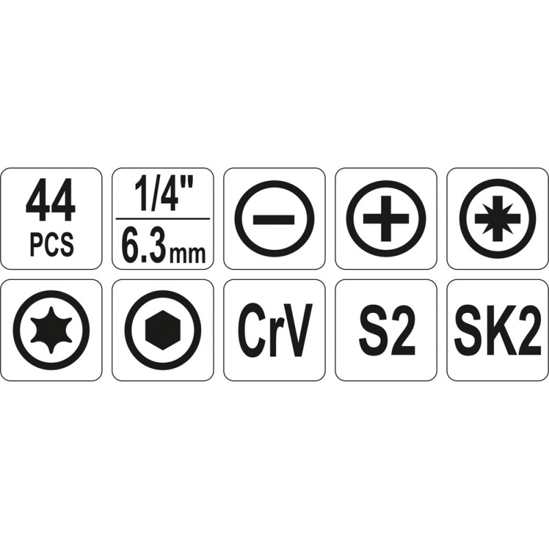 - Innensechskant-Bits 1/4" (6,3 mm): 2, 2,5, 3, 4, 5, 6 mm (L=25 mm): Stahl S2