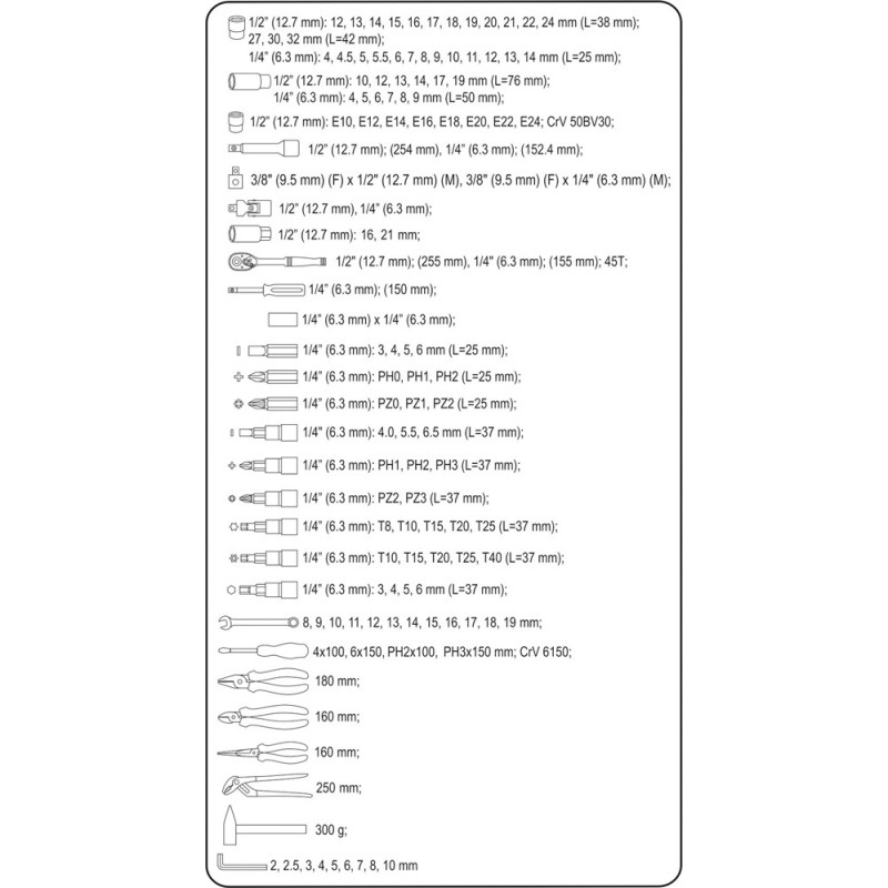 - Die Werkzeuge wurden präzise aus Materialien gefertigt, die ihre Zuverlässigkeit gewährleisten. Das Set enthält eine vollständige Auswahl an langen und kurzen Steckschlüsseleinsätzen in den Größen 1/4", 3/8" und 1/2", Verlängerungen, Kardangelenke und viele weitere Teile, darunter Ratschen mit 45 Zähnen.