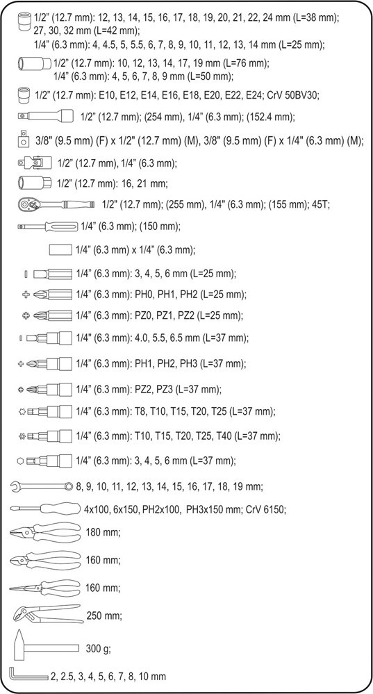 - Steckschlüsseleinsätze 1/4": 4, 4,5, 5, 5,5, 6, 7, 8, 9, 10, 11, 12, 13, 14 mm,