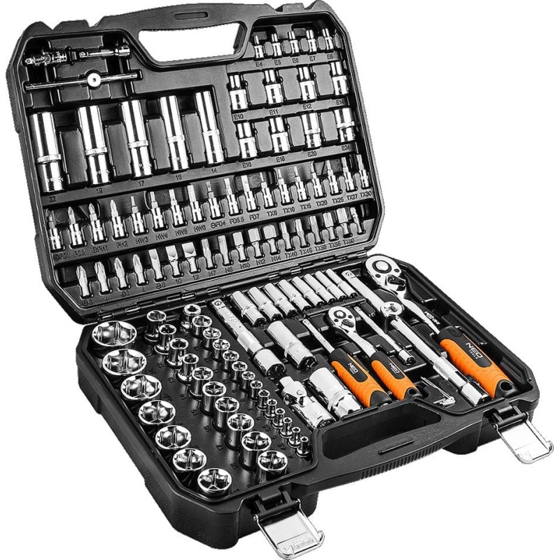 Praktischer NEO-Steckschlüsselsatz im handlichen Koffer. Das Set enthält 110 Teile, darunter 1/2"- und 1/4"-Ratschenschlüssel mit ergonomisch geformten Griffen sowie einen Satz Sechskantsteckschlüssel, Torx-Steckschlüssel, Schraubendreherbits und weiteres Zubehör. Das gesamte Set ist aus hochwertigem Chrom-Vanadium-Stahl gefertigt, wodurch diese Werkzeuge nicht nur nützlich, sondern auch sehr robust sind.