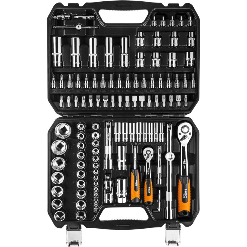 Ganz gleich, ob Sie beruflich als Heimwerker tätig sind und Steckschlüssel täglich bei der Arbeit verwenden oder ob Sie eher nur gelegentlich darauf zurückgreifen, wenn Sie selbst kleinere Arbeiten im Haus oder am Auto erledigen müssen. Das 110-teilige NEO-Set im praktischen Koffer ist eine hervorragende Wahl – alle Teile sind darin übersichtlich angeordnet und haben ihren festen Platz, wodurch es viel einfacher ist, die benötigten Werkzeuge auszuwählen und sie in einwandfreiem Zustand zu halten. Anstatt im Werkzeugkasten oder in der Schublade nach dem richtigen Schlüssel zu suchen, reicht es, nach dem Griff und dem gewünschten Aufsatz zu greifen. Der Koffer erleichtert zudem die sichere Aufbewahrung des Sets und dessen bequemen Transport.