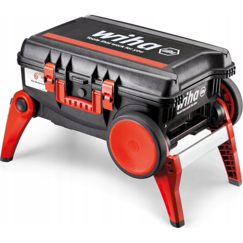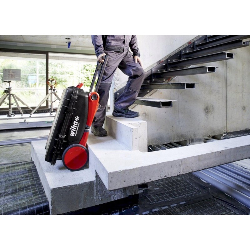 Der Werkzeugkoffer Wiha XXL 4 wurde für maximale Mobilität konzipiert. Ausgestattet mit großen Rädern ermöglicht er ein einfaches Bewegen auch in unwegsamem Gelände. Die stabile Konstruktion mit verbreiterten Standfüßen sorgt für hohen Bedienkomfort, und die ergonomischen Griffe entlasten Rücken und Gelenke, was bei lang andauernden Arbeiten entscheidend ist.