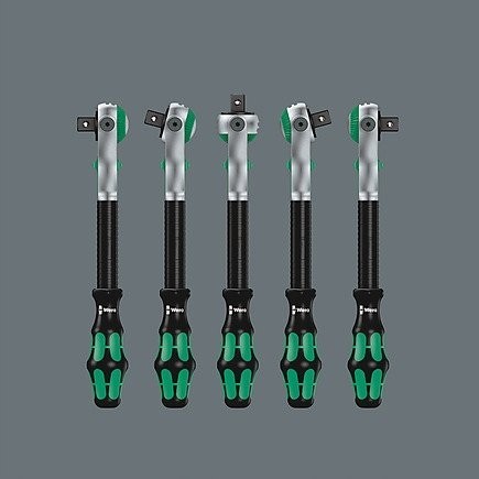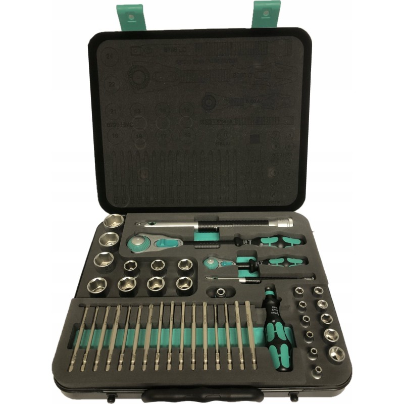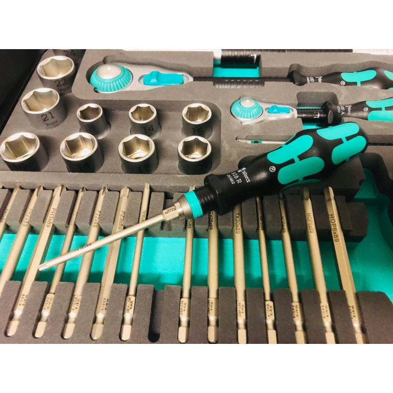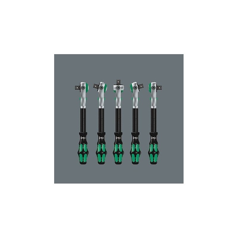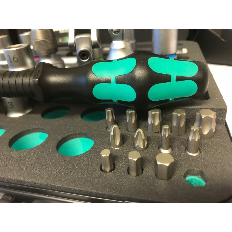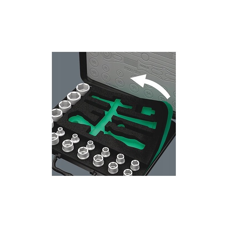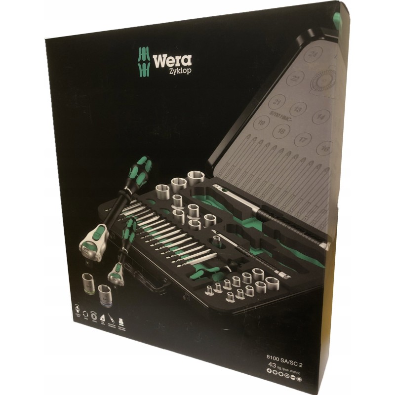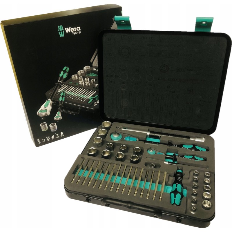 43-teiliges Zyklop-Set im robusten Metallkoffer: 1 Zyklop-Schnellratsche mit 1/4"-Adapter, 1 Zyklop-Schnellratsche mit 1/2"-Adapter. Die präzise 72-Zahn-Teilung sorgt für einen geringen Drehwinkel von 5°. Die Ratsche verfügt über einen schwenkbaren Kopf, der dank eines beidseitigen Arretierungsschalters in jeder Position arretiert werden kann. Dies gewährleistet komfortables Arbeiten auch an sehr engen oder schwer zugänglichen Stellen und bietet ausreichend Bewegungsfreiheit für die Hand. Die Arretierung des Kopfes in den Positionen 0°, 15° und 90° nach rechts und links gewährleistet eine sichere Handhabung und verhindert ein Abrutschen des Ratschenkopfes. In der 0°-Position kann sie mit Hilfe eines Adapters und Bits wie ein gewöhnlicher Schraubendreher verwendet werden. Die Konstruktion nutzt die Masse des Werkzeugs für eine schnellere Montage. Der symmetrische Griff mit drehbarer Kraftform-Hülse ermöglicht schnelles Drehen. Die Form des Kraftform-Griffs passt sich perfekt der Hand an und schützt sie vor Scheuerstellen und Druckstellen. Harte Materialelemente am Griff ermöglichen ein gleichmäßiges Drehen, ohne dass die Hand auf dem Griff verrutscht. Weiche, rutschfeste Bereiche ermöglichen die Übertragung großer Kräfte ohne Verlust der Griffigkeit. Im Lieferumfang enthalten sind Werkzeugaufnahmen und 1/4"-Wechselaufsätze mit Verriegelungsmechanismus. 21 Zyklop-Werkzeugaufnahmen, 2 Zyklop-Verlängerungen mit beweglicher Hülse, 1 Kraftform-Griff mit Halterung für Bits und Steckschlüsseleinsätze sowie Schnellwechselkupplung; 16 Bits. Wera-Werkzeuge mit „Take it easy“-Funktion: farbige Kennzeichnung der Aufnahmen entsprechend ihrer Größe.