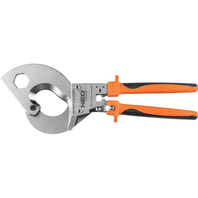NEO-Kabelschneider für Kupfer- und Aluminiumkabel (Art.-Nr. 01-401) mit einer Schnittlänge von 400 mm und Ratschenmechanismus. Die gehärteten Backen schneiden Kabel mit einem Querschnitt von bis zu 400 mm². Hochwertiger Chrom-Vanadium-Stahl gewährleistet eine lange Lebensdauer der Backen. Der ergonomische, gummierte Griff erhöht den Bedienkomfort. Die Qualität des Werkzeugs wird durch ein TÜV-Zertifikat und eine 25-jährige Herstellergarantie bestätigt. Die Marke NEO erfüllt die Erwartungen von Profis.